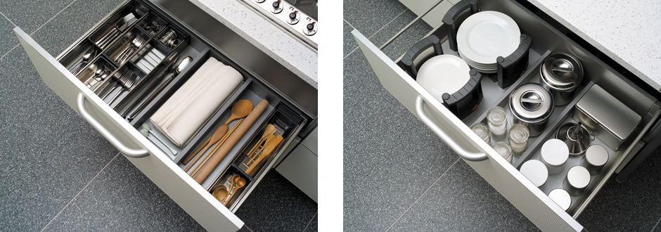 大、小、长、短…厨房的收纳物形状各式各样。抽屉内凌乱不堪、想用的又找不到…容易发生这种情况。内盘的隔板可根据物品的大小移动,快速变成可收纳的形状。碟架等配件也很丰富。