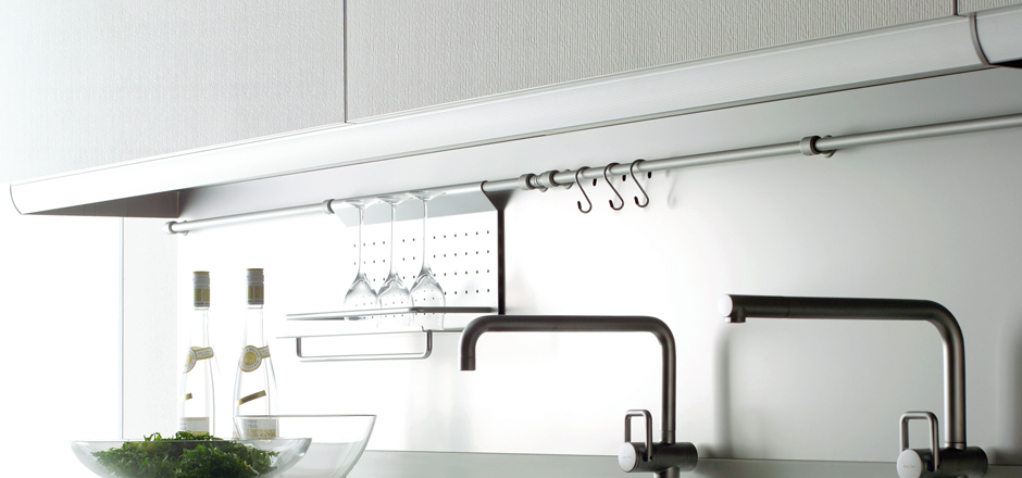 壁挂式厨房特有的壁面收纳。左右拉开的管子上挂着钩子或多功能架子,漂亮地展示和收纳钟爱的工具和香料。由于是开放式收纳,因此能够更加高效地烹饪。打开食谱书立起的书架或杯架等结合喜欢的用法选择产品阵容也是其魅力所在。