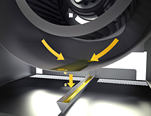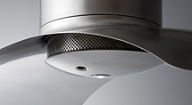 通过宛如包住般的抽油烟机牢牢捕捉油烟,诱进西洛克风扇。油烟从机体中心部分的吸气口一下子被吸进,通过内部的西洛克风扇被分离和排放。圆筒形的吸气口周围全被施加了冲孔加工,因此可高效地前后左右吸进油烟。