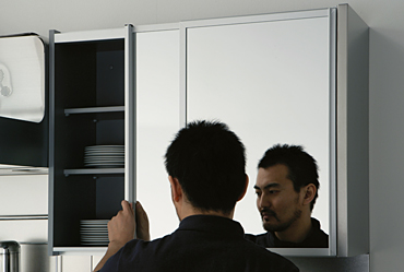 采用了推拉门,因此不会妨碍操作,能够预留的通道也很宽。此外,镜门降低了它的存在感,使屋内显得更宽敞。准备了镜子、铝板、玻璃等3种类型的门板。