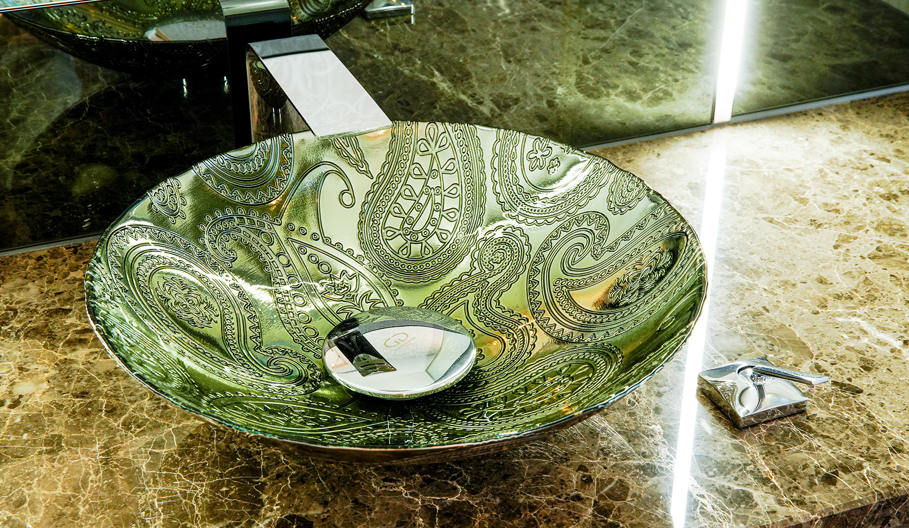 背面には、セクシーな赤い唇をヴェネツィアンモザイクで繊細に表現した収納が、空間にインパクトを与えています。
