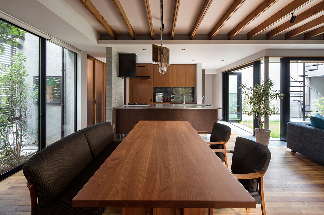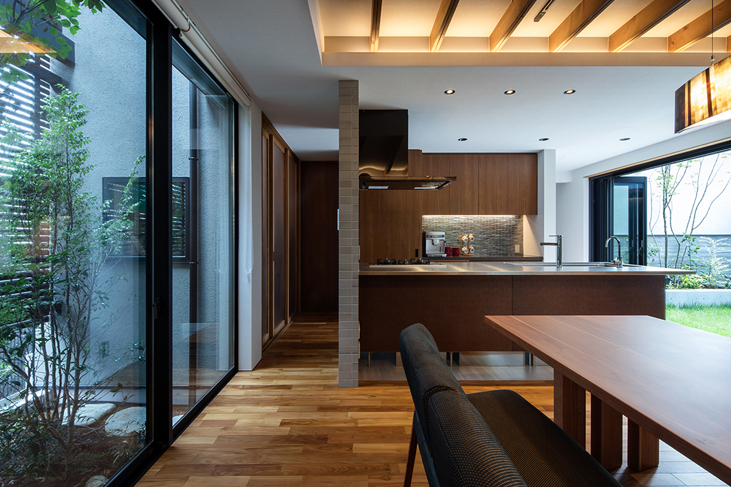 The kitchen flat layout allows for cooking while overlooking the three courtyards.