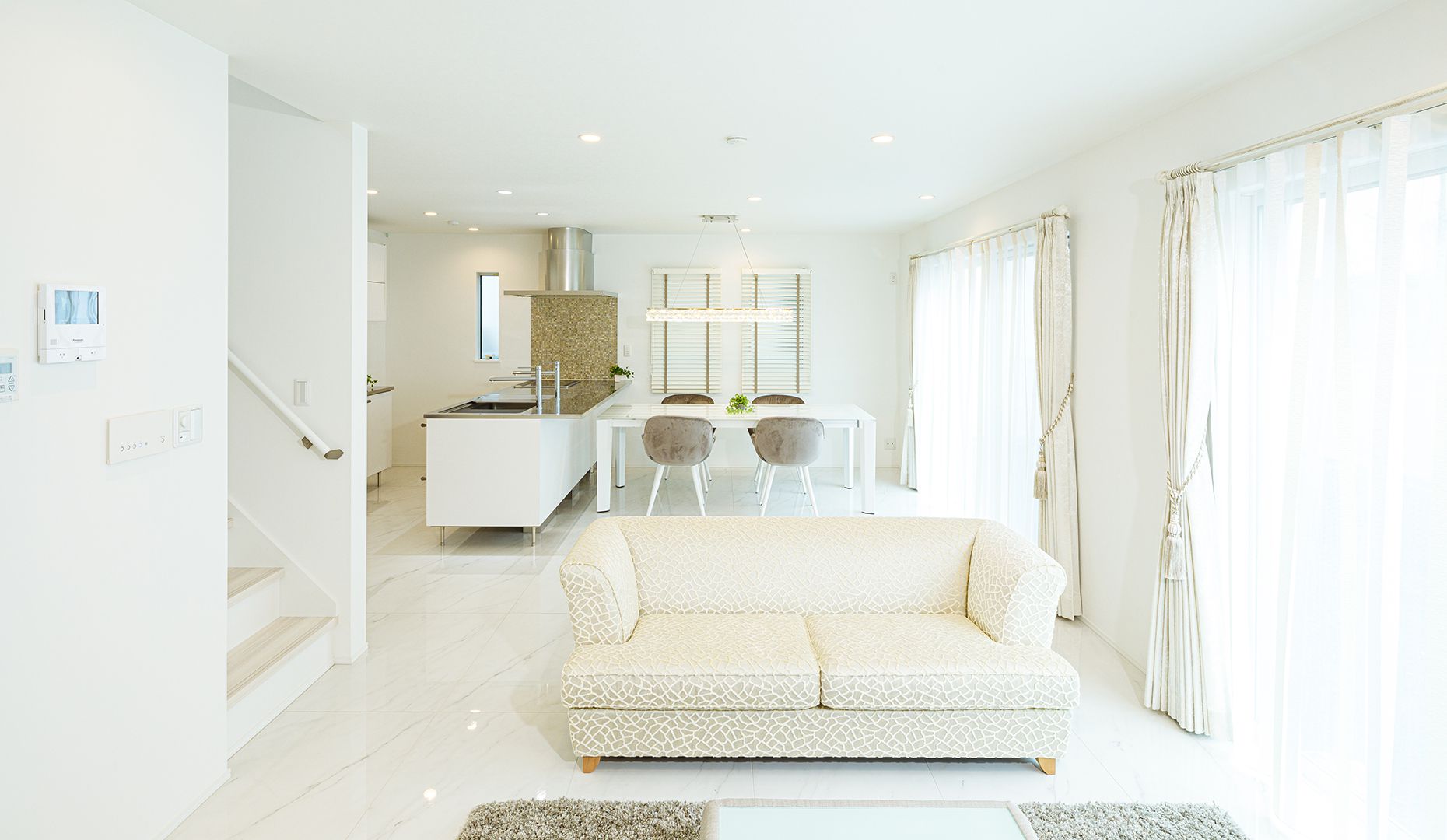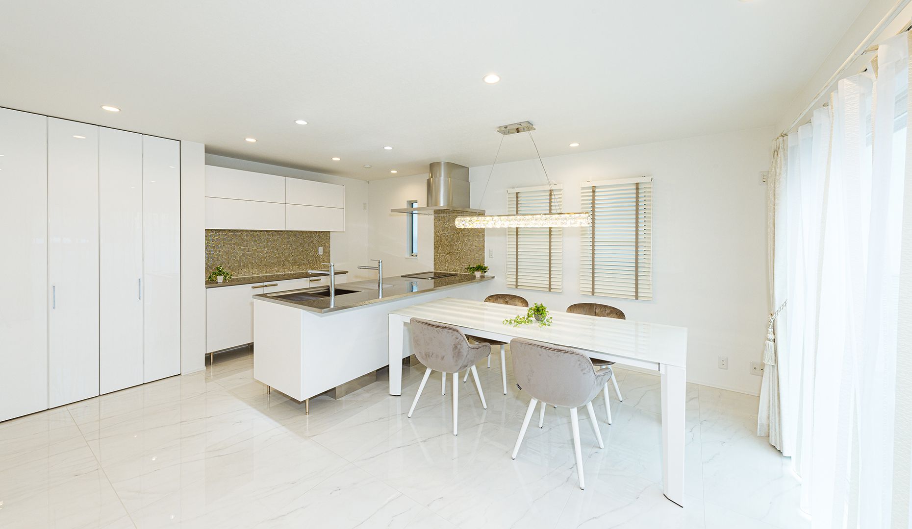 白いキッチンに合わせ、テーブルやソファもすべて白で統一しました。
