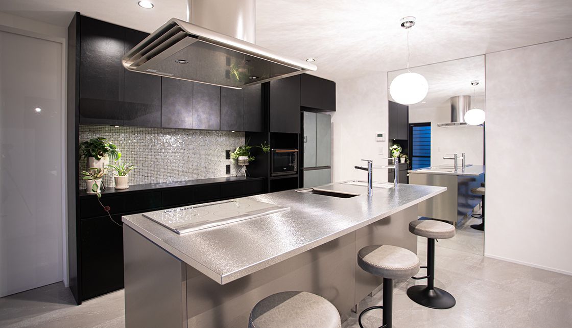 キッチン空間全体の壁にSICISのモザイクタイルを採用。虹色加工されたタイルは見るたびに違う表情を魅せてくれます。