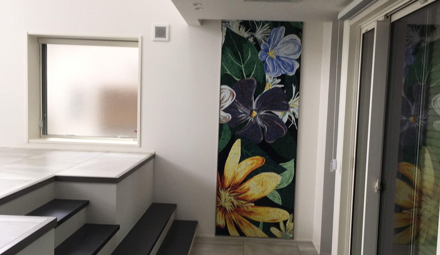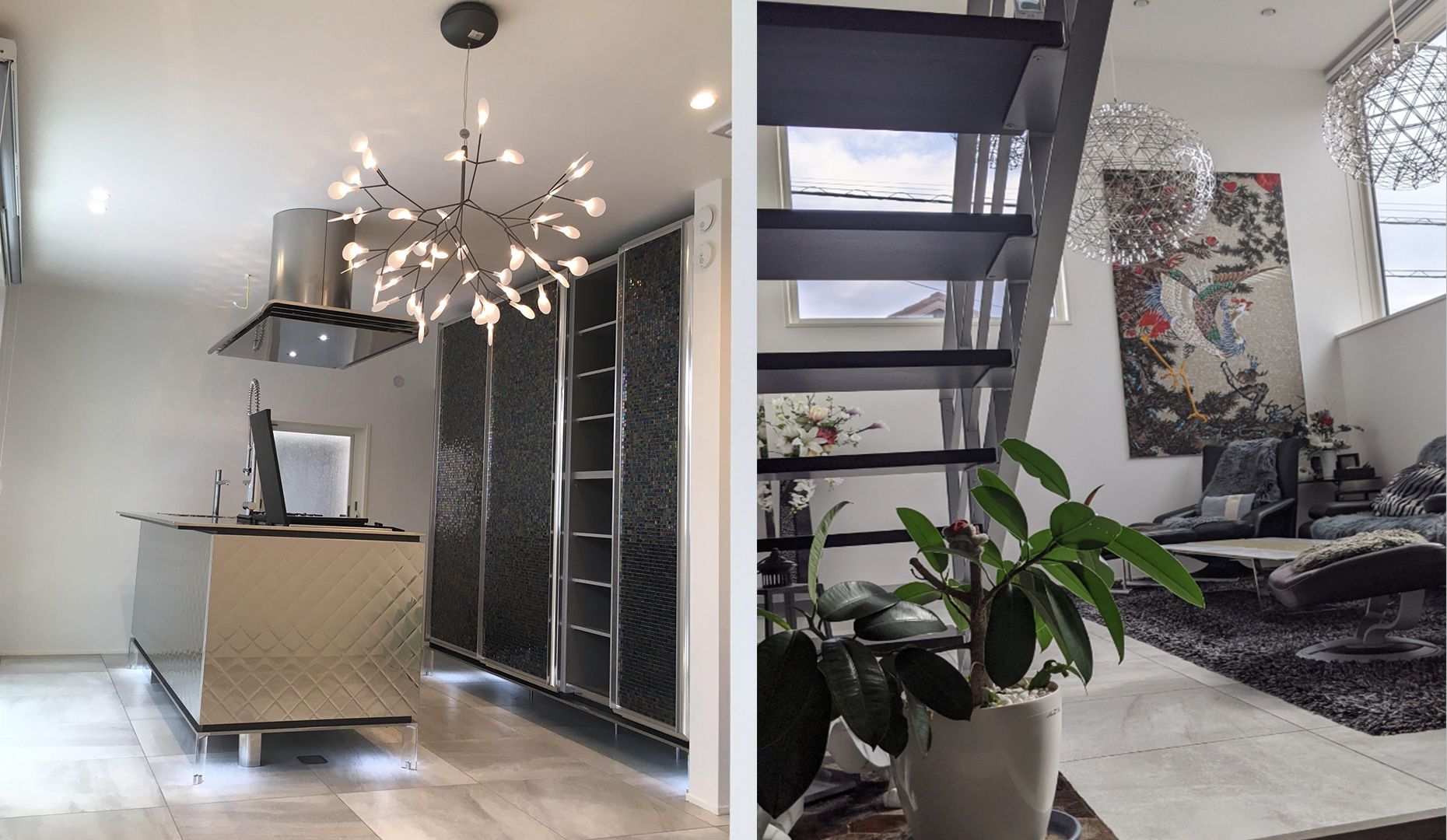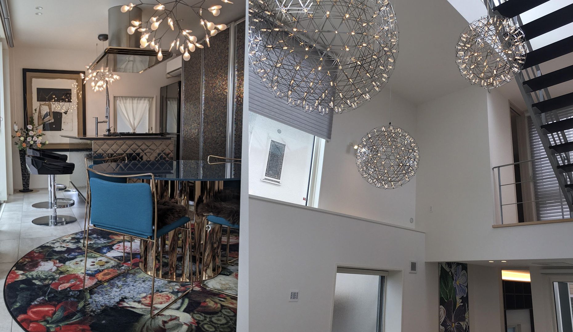 吹き抜けのリビング空間にはダイナミックに照明「レイモンド」が吊られ、SICISの伊藤若冲コレクションやフラワーパワーが絵画のように飾られており、とても印象的です。