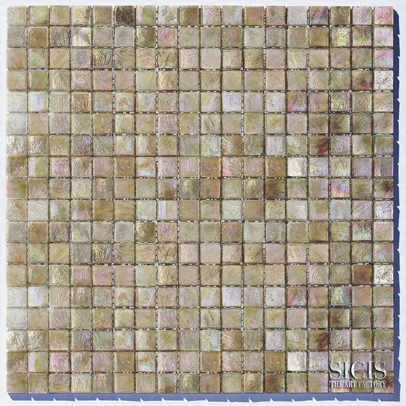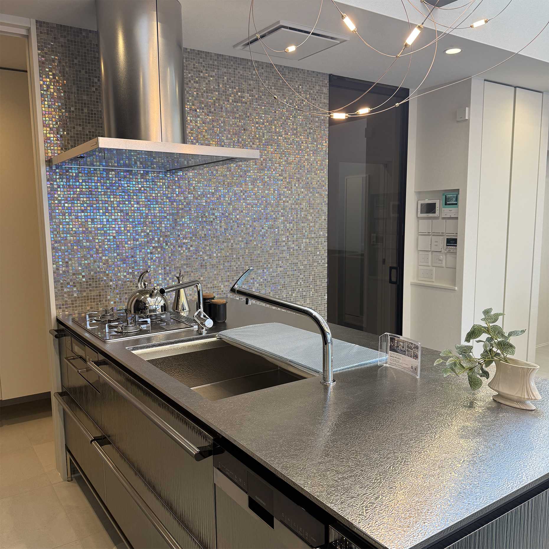 The kitchen with metallic doors blends beautifully with the monotone space. The wall next to the kitchen is covered with rainbow-colored SICIS tiles, which add depth to the space.