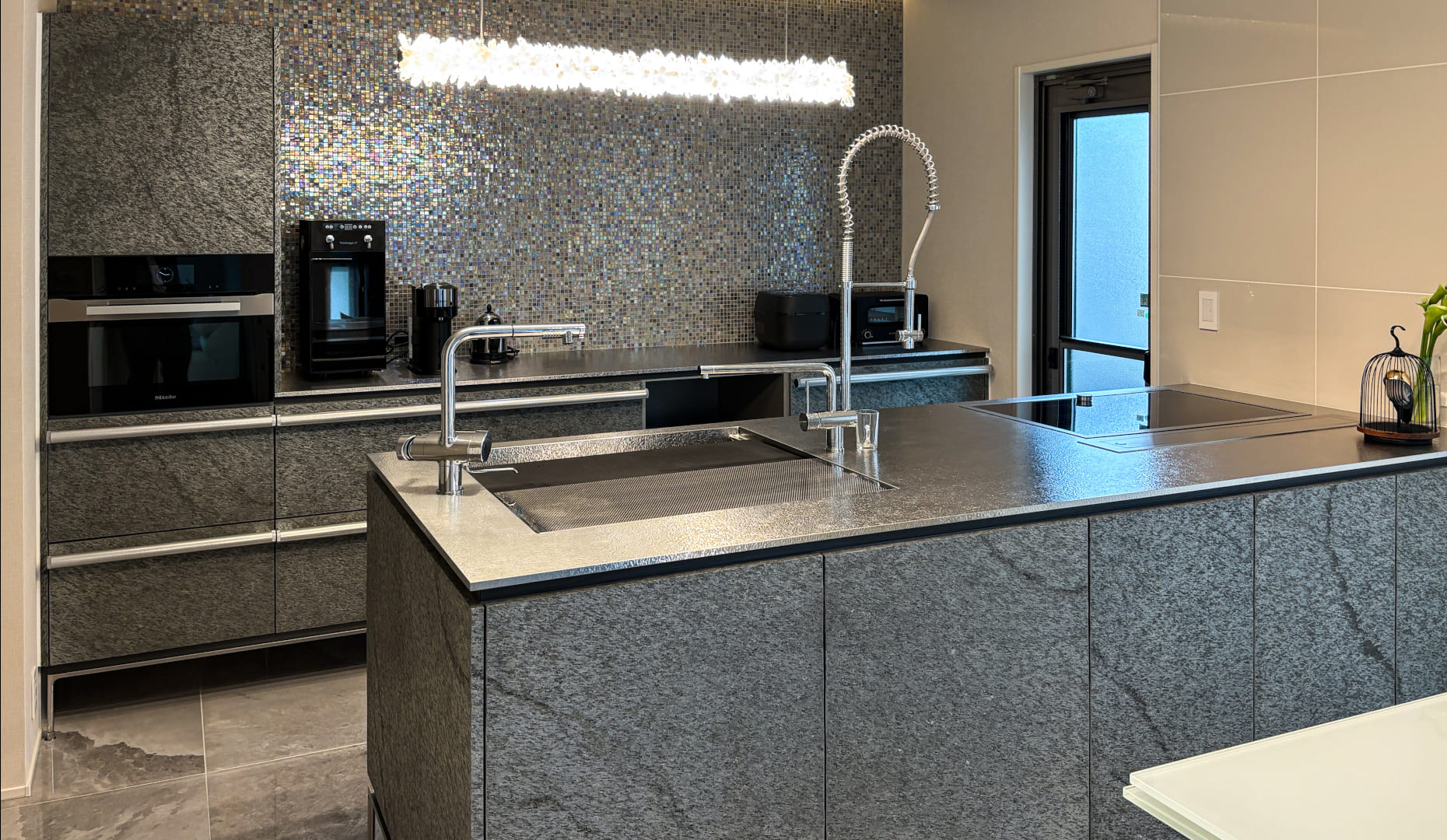 The natural crystals of the Klunker Bar L100 Natural above the kitchen resonate with the kitchen, and the SICIS mosaic tiles (Zinnia 3) on the wall