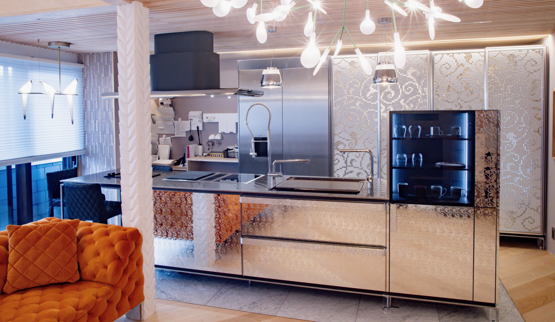 クリスタルとモザイクタイルが煌めくY様邸のキッチンは、空間デザイナーである奥様の審美眼が息づく特別な場所。取っ手にスワロフスキーをあしらった「スピーガトレ」と、立体模様が美しいワークトップ「キルトマット」が上質な輝きを放ちます。収納ブロックやパラレロシンクにより動線が整い、家族が自然と集まる心地よいLDKに。キッチンとダイニングをシームレスにつなげたことで、料理の時間も家族で共有できる空間が実現しました。