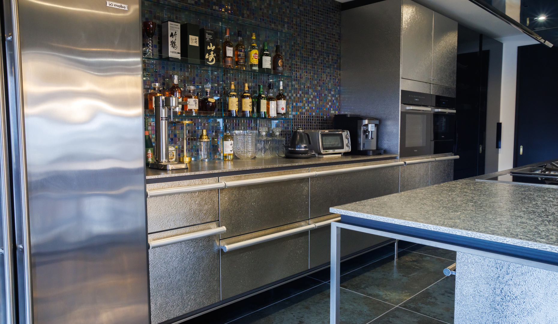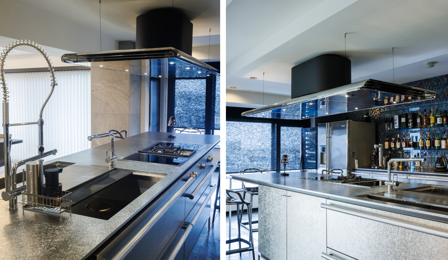 さらに、ラボのような機能美に天然石やタイルの素材感を重ねることで、上質で温もりある空間に仕上げました。多くの人が集い、料理を囲む時間を自然に楽しめる住まいです。