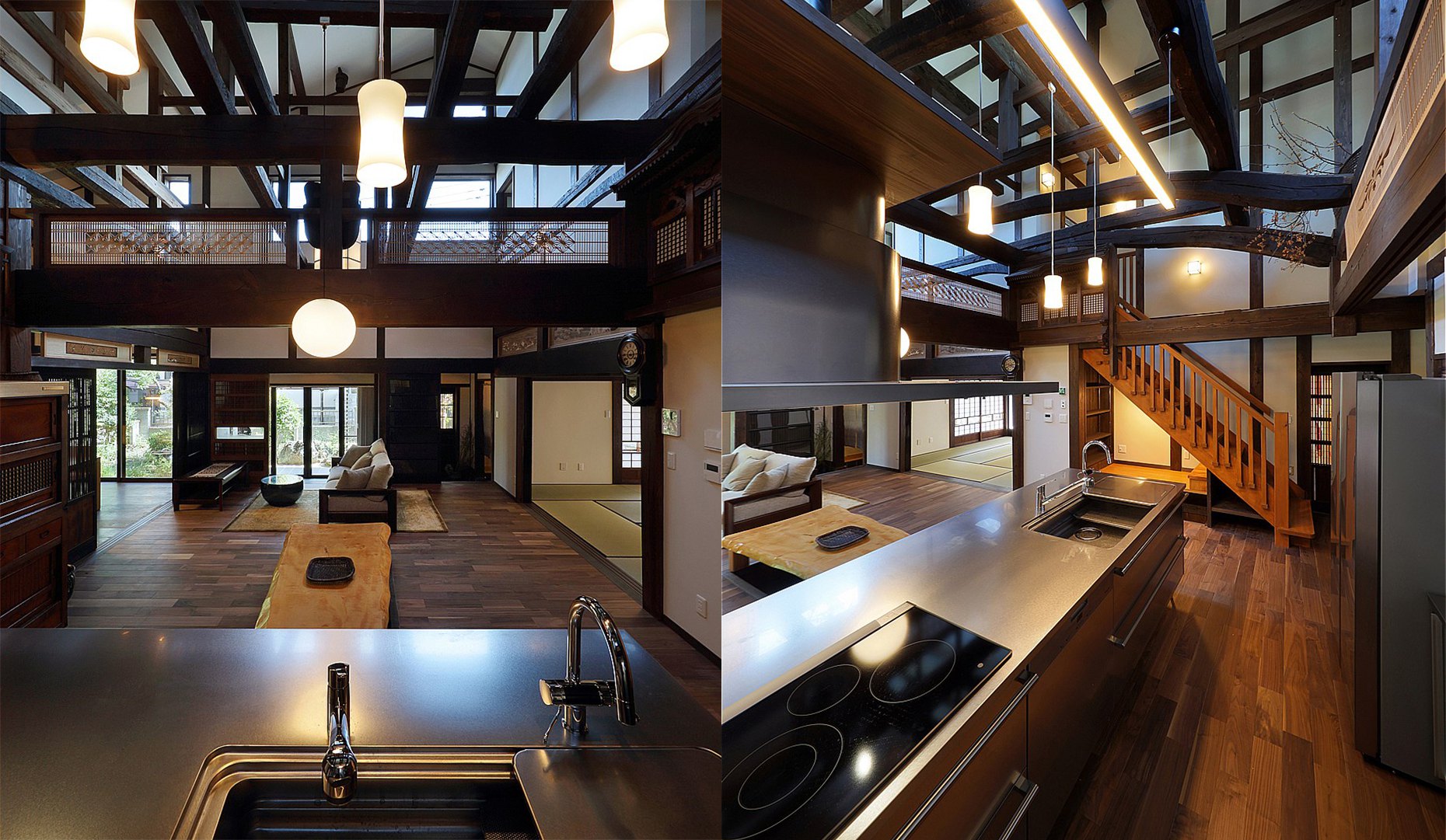 The kitchen is arranged in such a way that the living room can be viewed even when standing in the kitchen, and the kitchen can be used comfortably in the limited space.