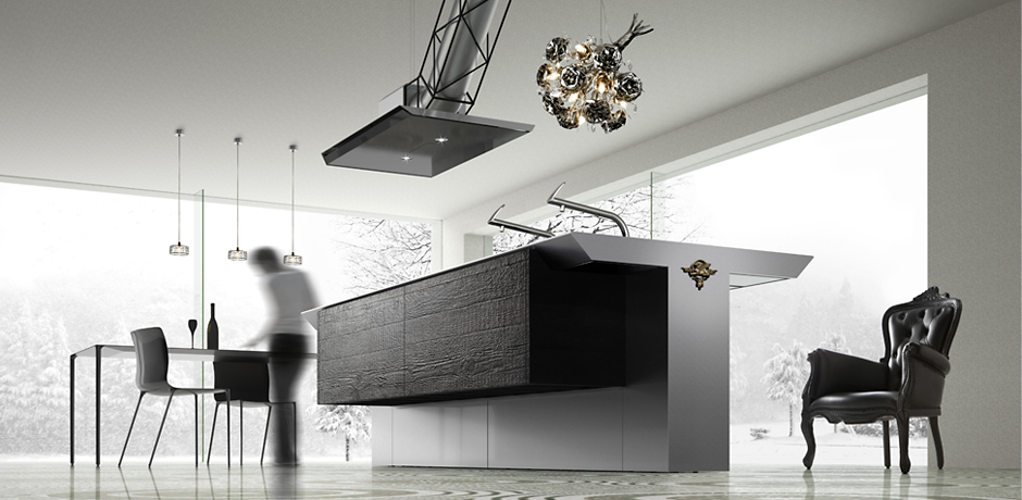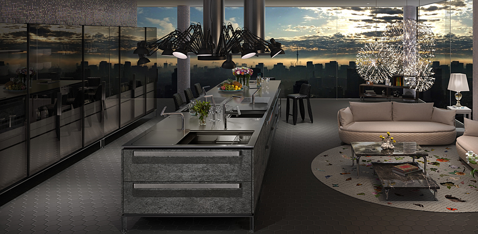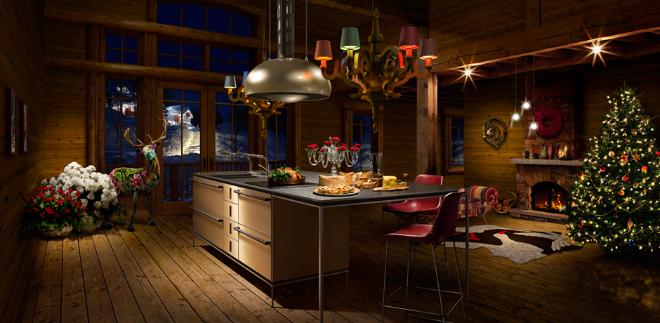 家人欢聚于浓缩了功能的紧凑的厨房里。