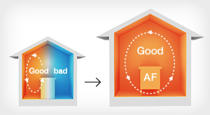厨房设置在客厅,如同房间内建造的墙壁。因此空气只在客厅内流动。因为烹饪,厨房侧的空气流动会进一步恶化。尽管客厅很舒适,但是厨房里的人会被“冷”“热”所折磨。airflow厨房从地面浮动,因此可实现房间整体的空调管理。脚底通气良好是厨房设置在客厅中央的关键因素。