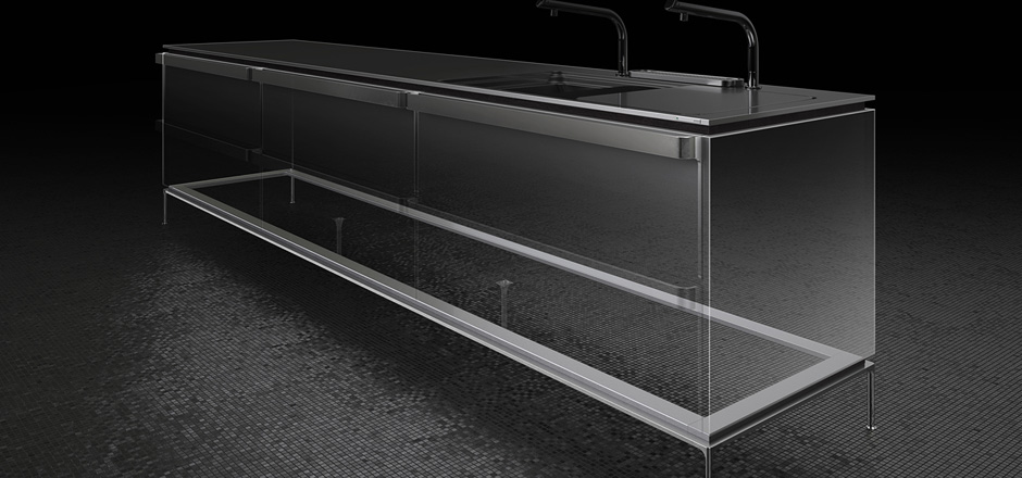 纤细的airflow是在支撑厨房整体的基架上固定了各个设备,形成一块坚固的整体,因此即便是超细也能牢牢地支撑起厨房。而且通过这种结构最低限度地减少了腿的数量。此外,在厨房中心部位采用透明的airflow,实现了高强度。