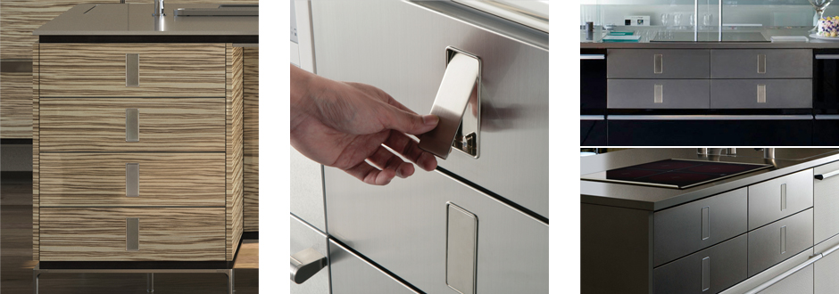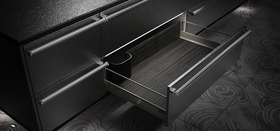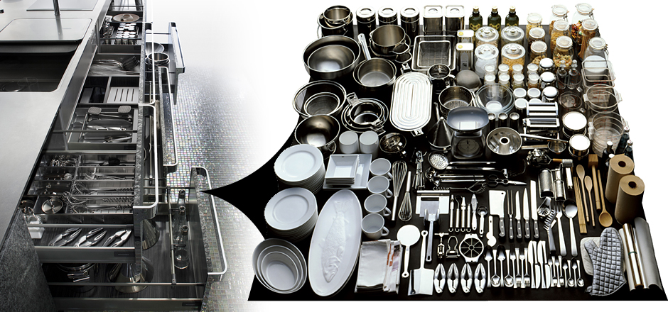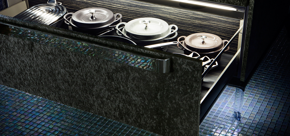 用于存放厨房周围的小物件的4层抽屉。不锈钢毛丝面加工,手柄完全被平面化处理,不会碍手碍脚,完全匹配厨房整体的简约而巧妙的形象。