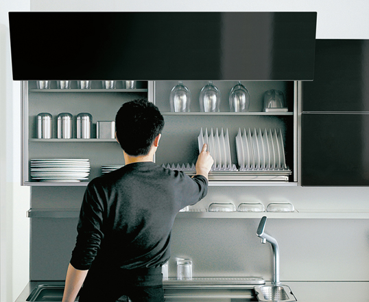 轻按柜门就能轻松操作,可自动地开闭柜门。厨房里的操作更加顺畅,实现流动的动线的新系统。内置的传感器探测地震的震颤后停止供电。紧急情况下防止从壁柜里坠落。