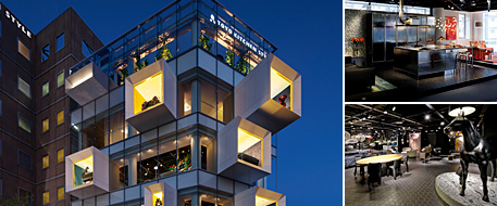 被命名为“大展示厅”的超过800坪(约2640平方米)的世界最大的厨房内饰空间。平台式展示和SICIS的大型面板、moooi空间等能体验“住居的娱乐化”的展示厅。桥本夕纪夫先生设计的充满浮游感和透明感的建筑也很有特色。