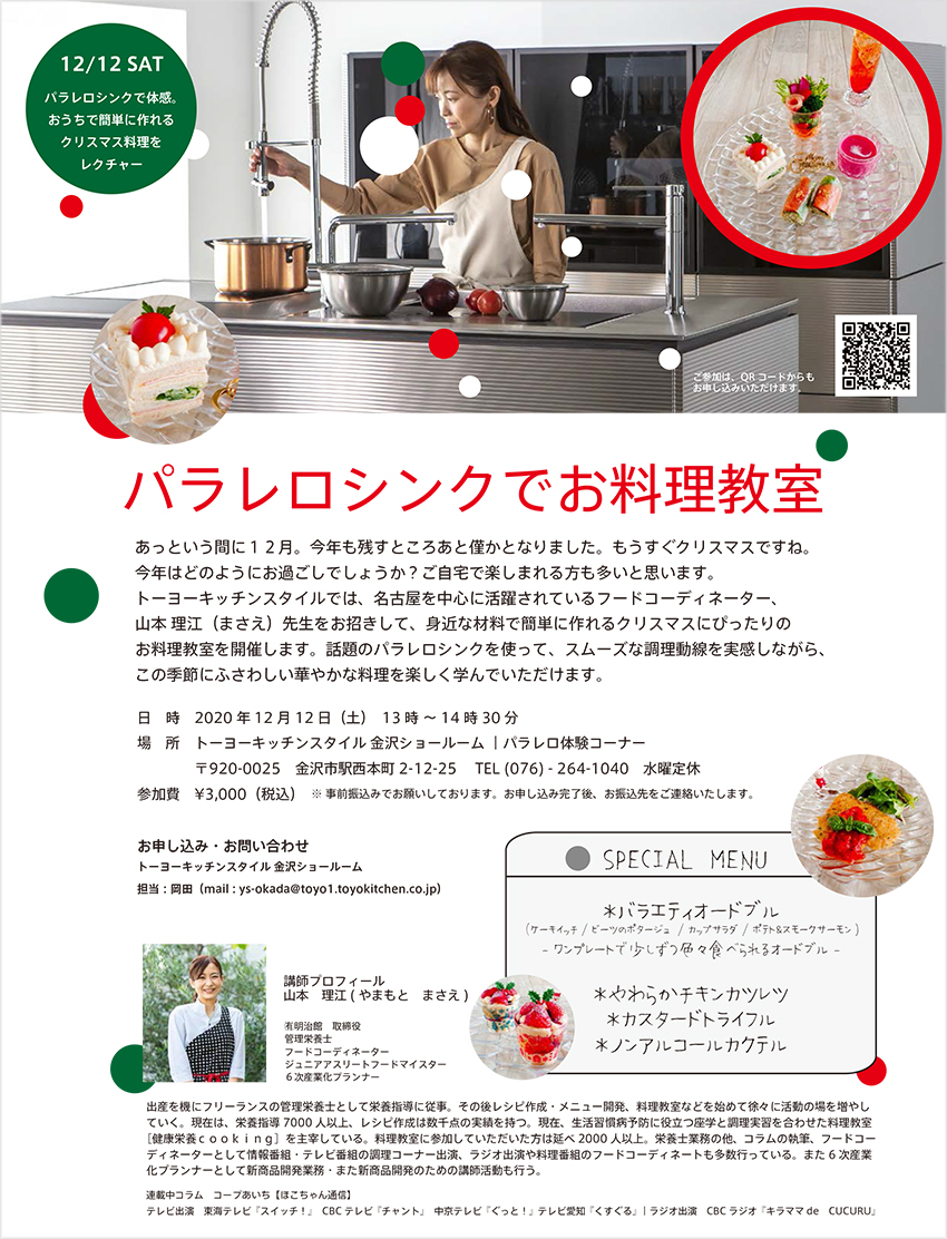 トーヨーキッチンスタイルでは、名古屋を中心に活躍されているフードコーディネーター、山本 理江(まさえ)先生をお招きして、身近な材料で簡単に作れるクリスマスにぴったりのお料理教室を開催します。