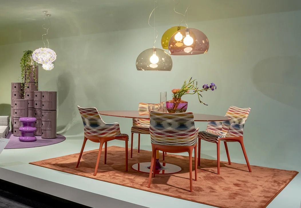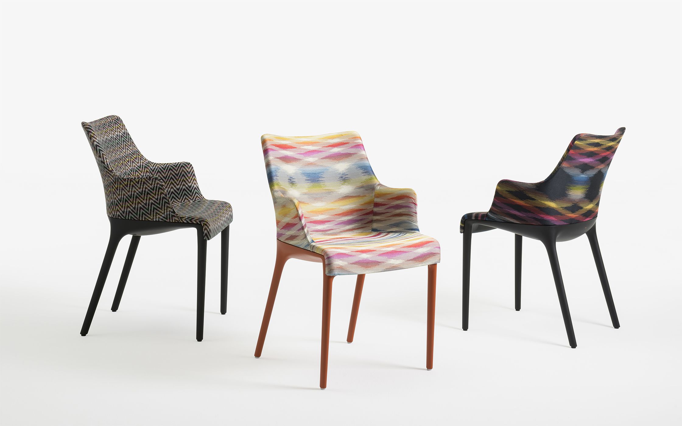 エレガンツァミッソーニの巧みなファブリック使いは、ミッソーニのブランドの美意識に通じ、トレードマークであるジグザグ模様は、ダークカラーをベースにカラフルなパターンで表現、Kartellの象徴的なスタイルと見事に調和し、インパクトのある幾何学的デザインを生み出しています。