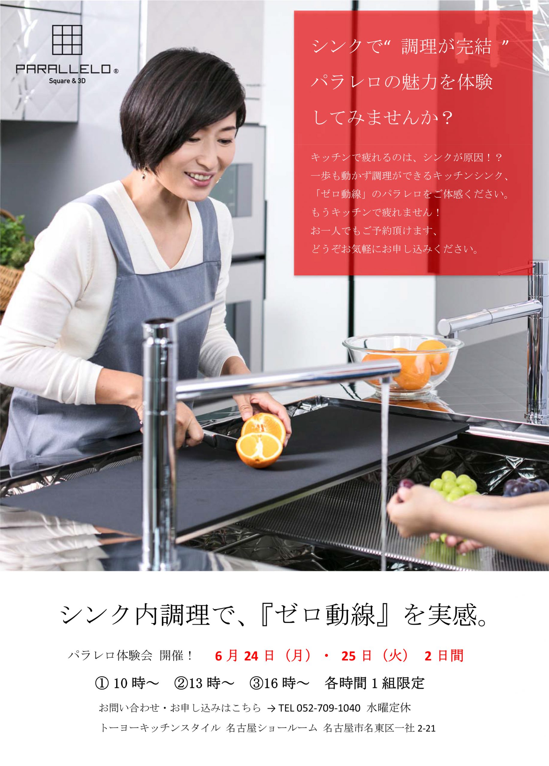 シンクで"調理が完結"パラレロの魅力を体験してみませんか? キッチンで疲れるのは、シンクが原因!? 一歩も動かず調理ができるキッチンシンク「ゼロ動線」のパラレロをご体感ください。 もうキッチンで疲れません。 お一人さまでもご予約いただけます。 どうぞお気軽にお申し込みください。 日時:2024年6月24日(月)・25日(火) 10:00~ / 13:00~ / 16:00~ 各回一組様限定 参加ご希望の方は下記お申し込みフォームよりご予約ください。 ご予約フォーム お電話でも受け付けております。 TEL:052-709-1040(担当:森前) 参加は無料です。 みなさまのご参加、お待ちいたしております。