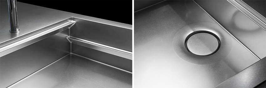 職人技によるチタン研磨仕上げを施したステンレスワークトップは、表面に繊細な加工をすることでキズやくもりを目立ちにくくし、柔らかい反射が冷たい印象のステンレスに温かみを感じさせます。