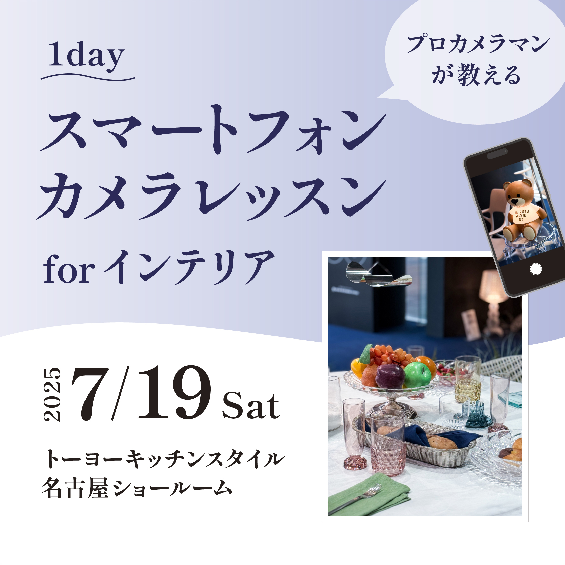 ショールームでの開催にちなみ、インテリアや空間を撮影する際のポイントや、テーブルコーディネートを美しく切り取るためのコツ、撮影後の編集まで実践しながら学んでいただけます。