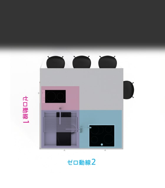 Most parallel kitchen layouts have the heating equipment mounted on the wall. COOK ISOLA is Core Devices with heating and cooking. Placing Even in a base Living Core space, heating equipment can be laid out in the center of the room. The living line approaches zero, with comfortable access to the dining room and living room, which were far away from each other.