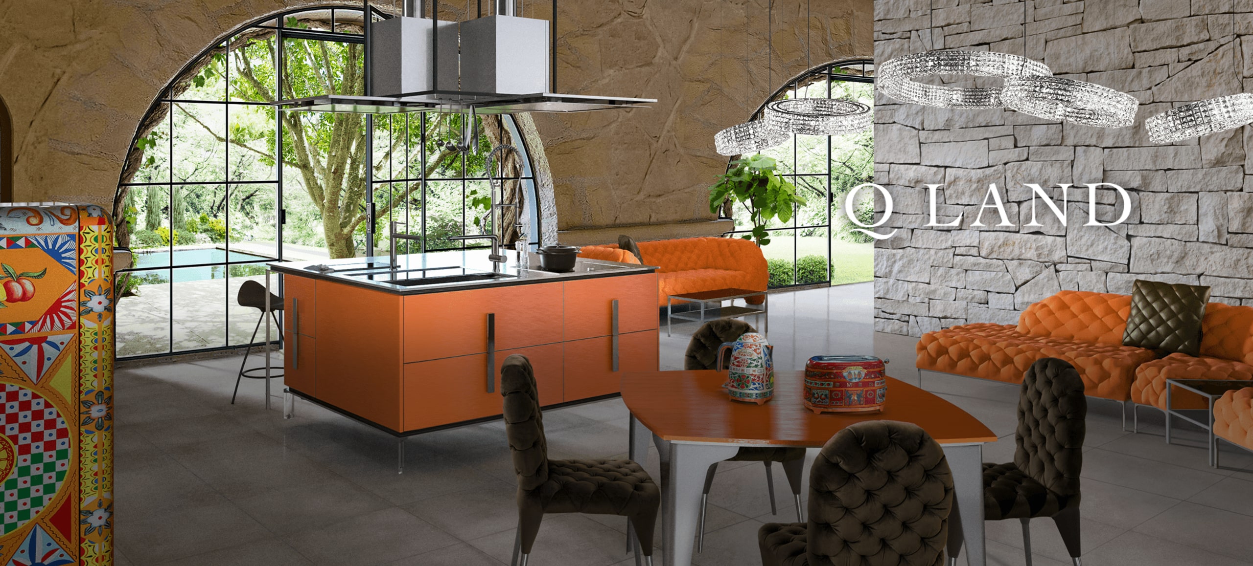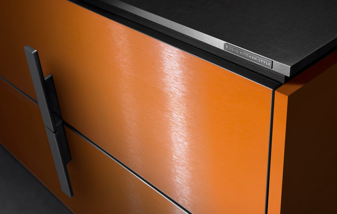 A vibrant orange that cheers up anyone who sees it. It has two sides: a fresh and cheerful side like the citrus fruits of Sicily, and a metallic texture with a hard, delicate hairline finish that reflects the light beautifully. It goes well with terra cotta colors, stone, and brownish interiors.