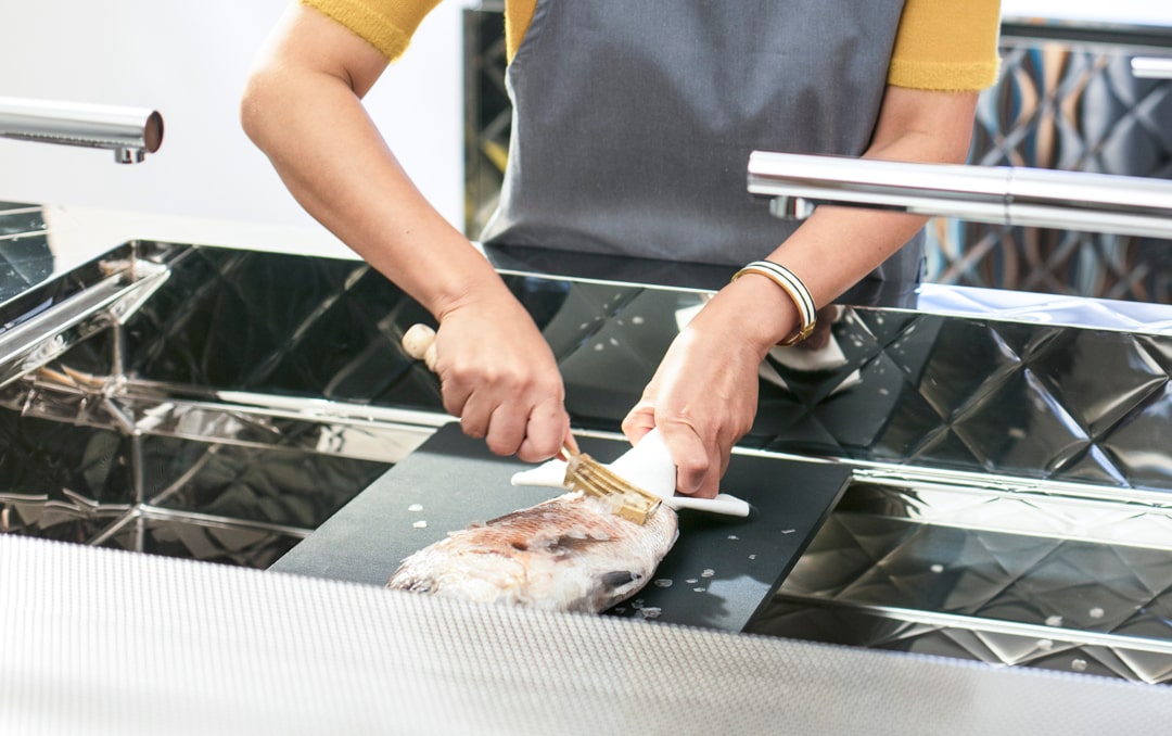 Cleanup is easy, as everything, including removing fish scales, can be done in the sink. PARALLELO The height of the plate can be set either up or down, so you can choose a position that is easy to use depending on your height.
