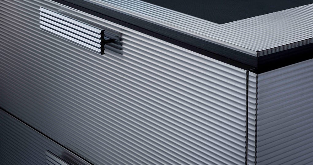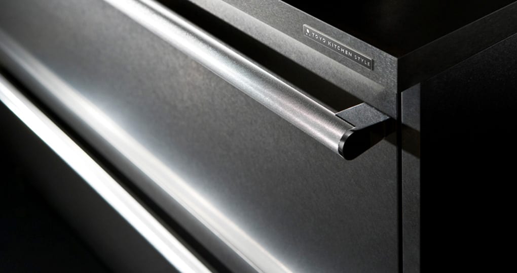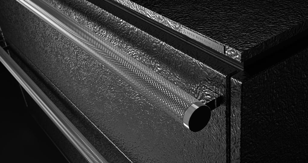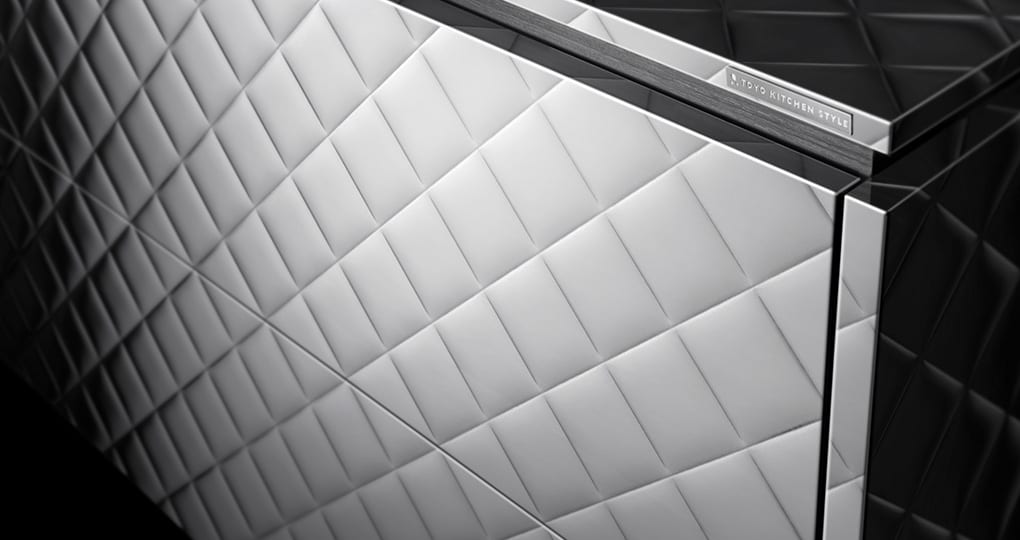 Matching worktop and kitchen door designs, such as quilted worktop x quilted door or linear worktop x linear metal door, allow you to enjoy a solid stainless steel mass design.