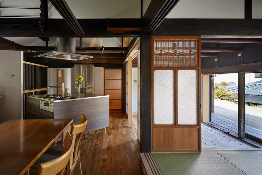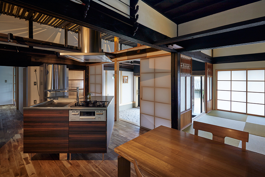 古民家の重厚なイメージに対して、i kitchenキューブの先進的なイメージ、異なるイメージ同士を組み合わせることで全く新しい印象を作り上げています。