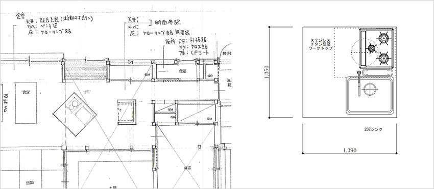ワークトップはステンレスでありながら、しっとりとした手触りのチタン研磨仕上げで、シンクには小さな間口でも余裕の作業スペースを確保できる2DSシンクを組み合わせています。