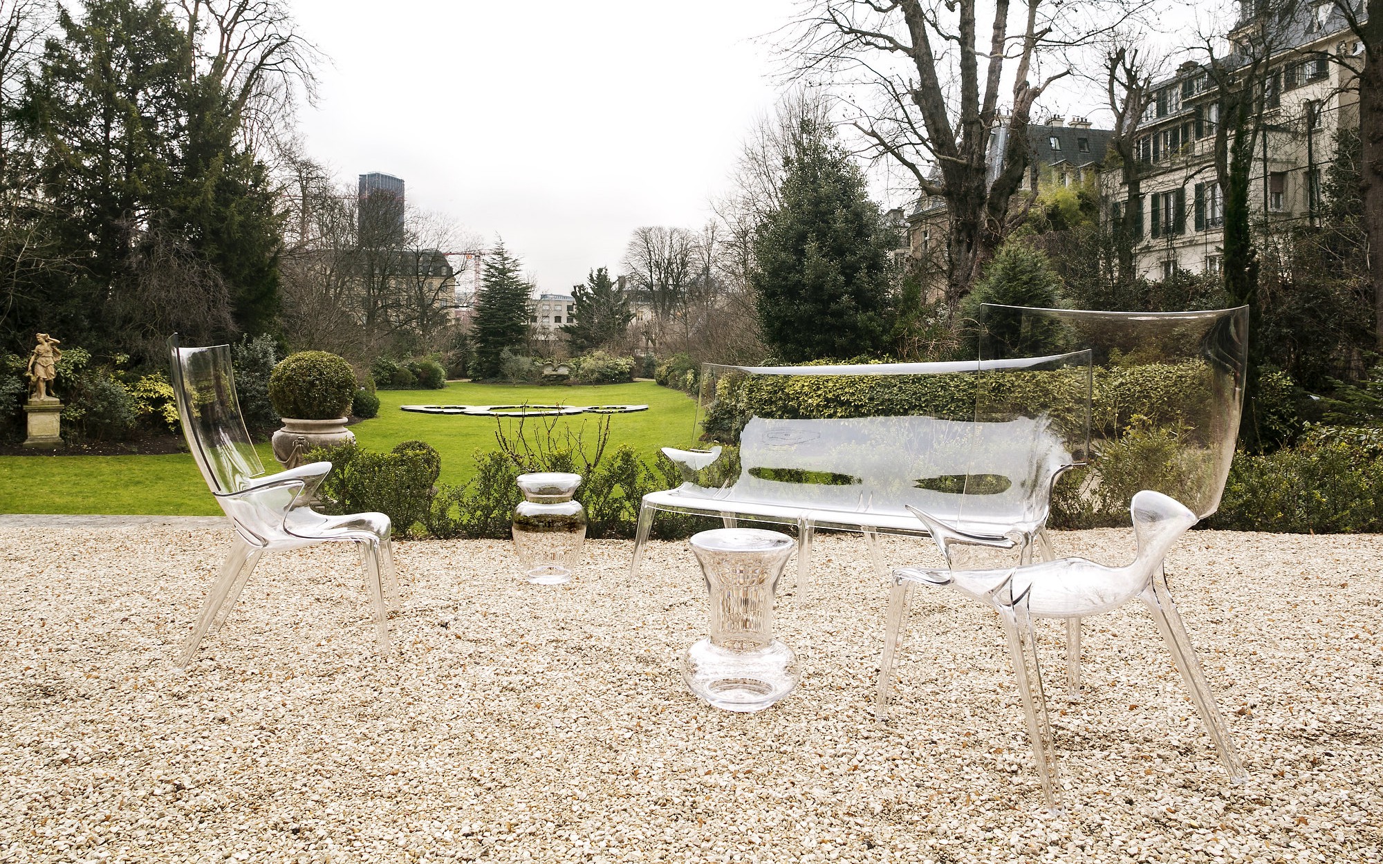 背もたれから座面、脚まですべて透明の一体成型で出来たソファは周囲の景色に溶け込み圧迫感を感じさせません。