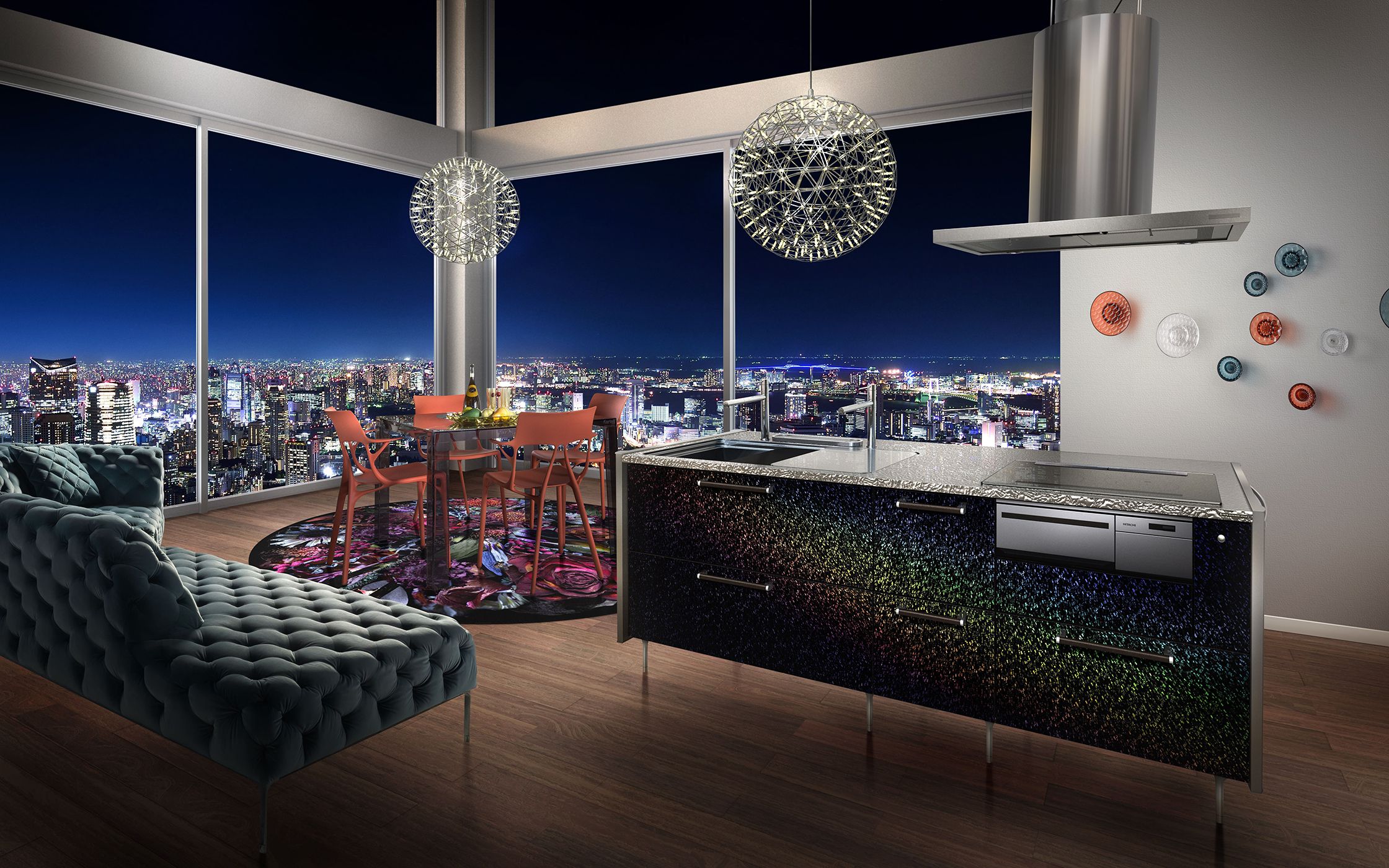キッチン本体はメタルフレームの頑丈なグリッド構造で、それを覆うスモークガラスを通して収納された道具類のシルエットがうかがえるようになっています。また、日本で初めて世界のデザイン賞2冠受賞を達成し、美しさや技術の水準の高さが世界的に認められたキッチンです。