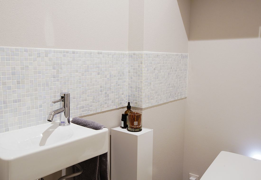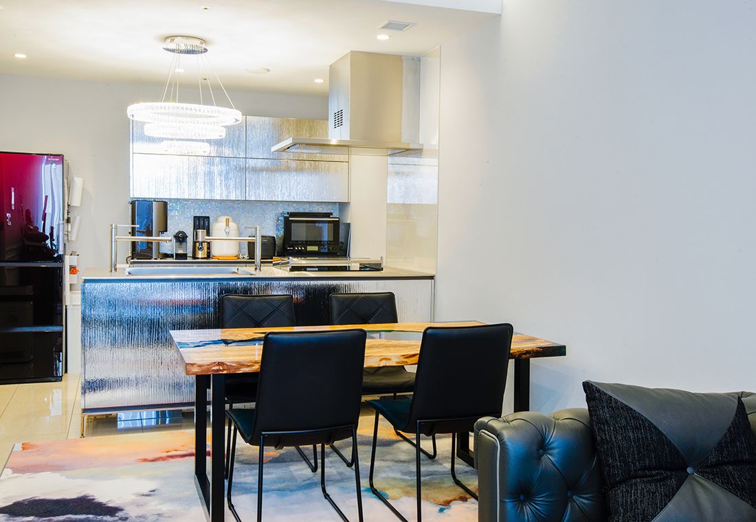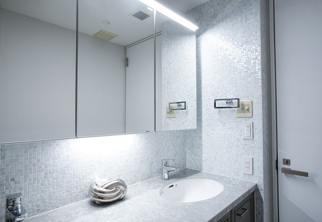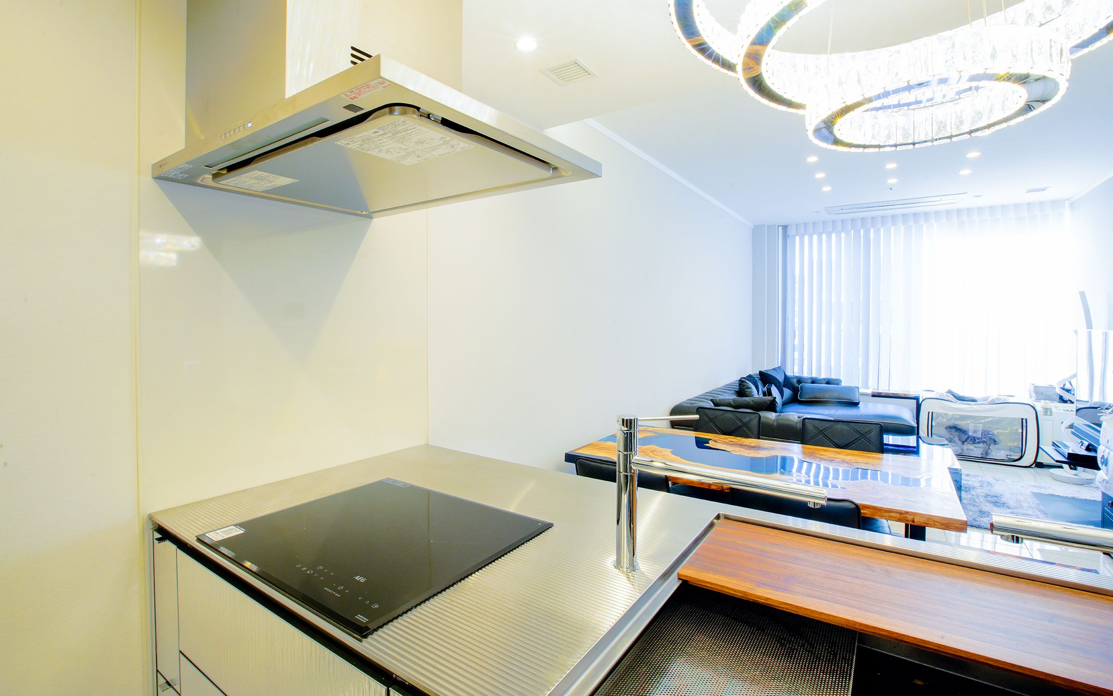 The white-based LDK is a stylish space with a sense of dignity and the sparkle of stainless steel and crystal.