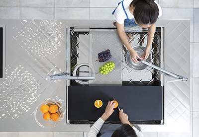 トーヨーキッチンスタイルの「パラレロ」、「3D シンク」は、シンクを立体的にフル活用することでシンク内での調理を実現しました。