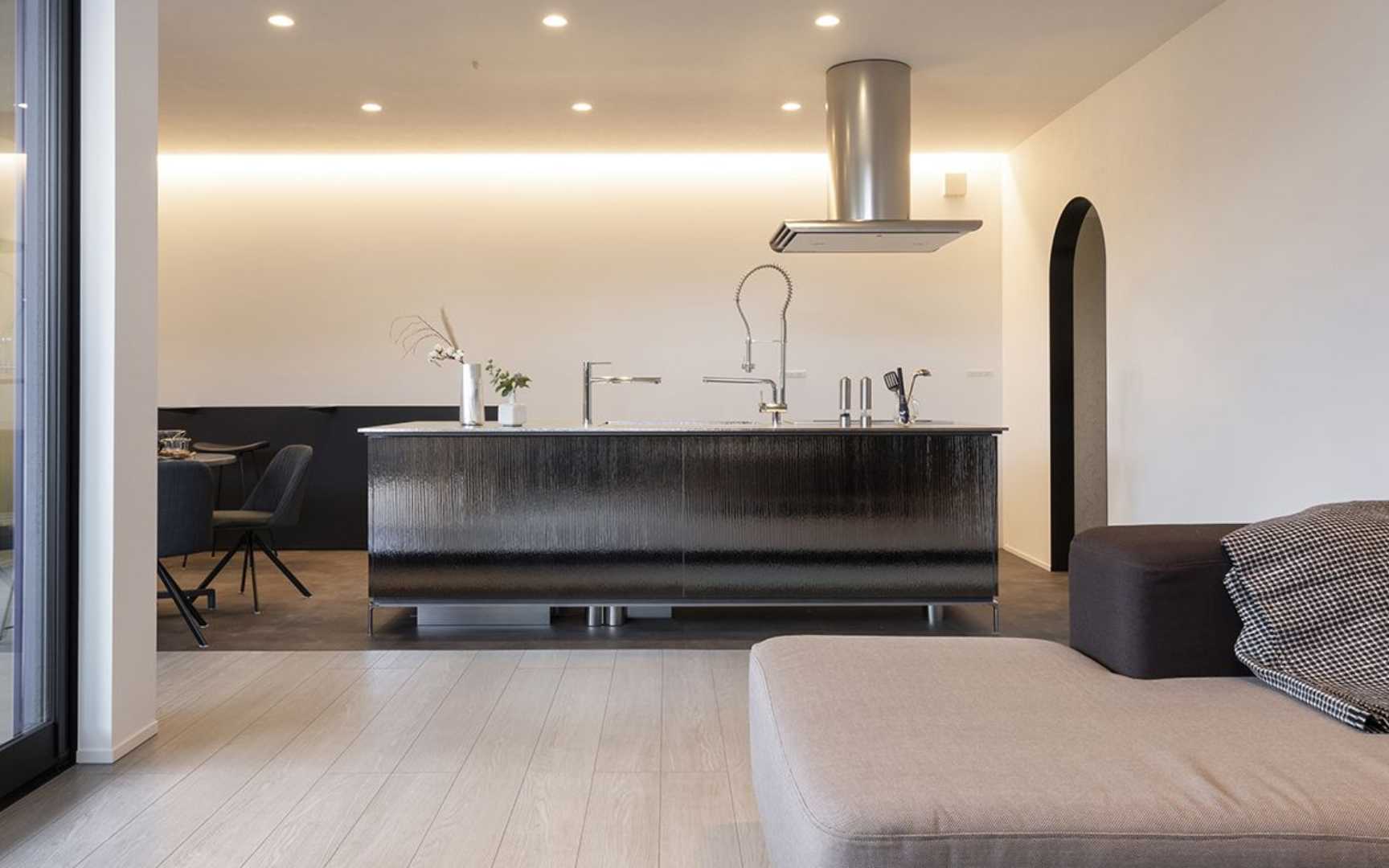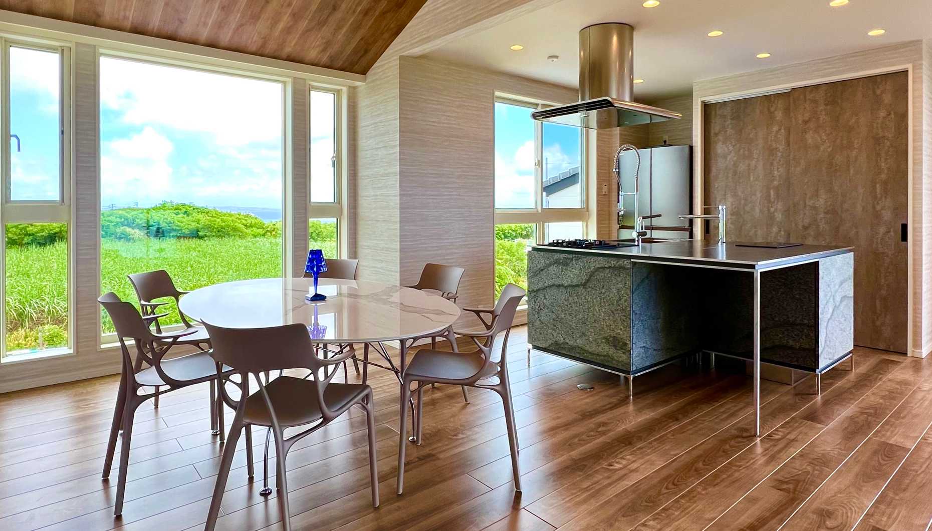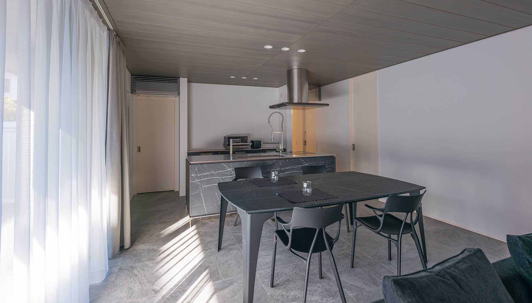 キッチンとダイニングテーブル一体型のアイランドキッチン。フルフラットでつながるキッチンとテーブルを囲むことで生まれるコミュニケーションにより、家族や友人と特別なひとときを過ごせます。テーブルスペースの設け方は様々。キッチンの幅や奥行きをカスタマイズすることで、間取りやライフスタイルに合わせたご提案が可能です。