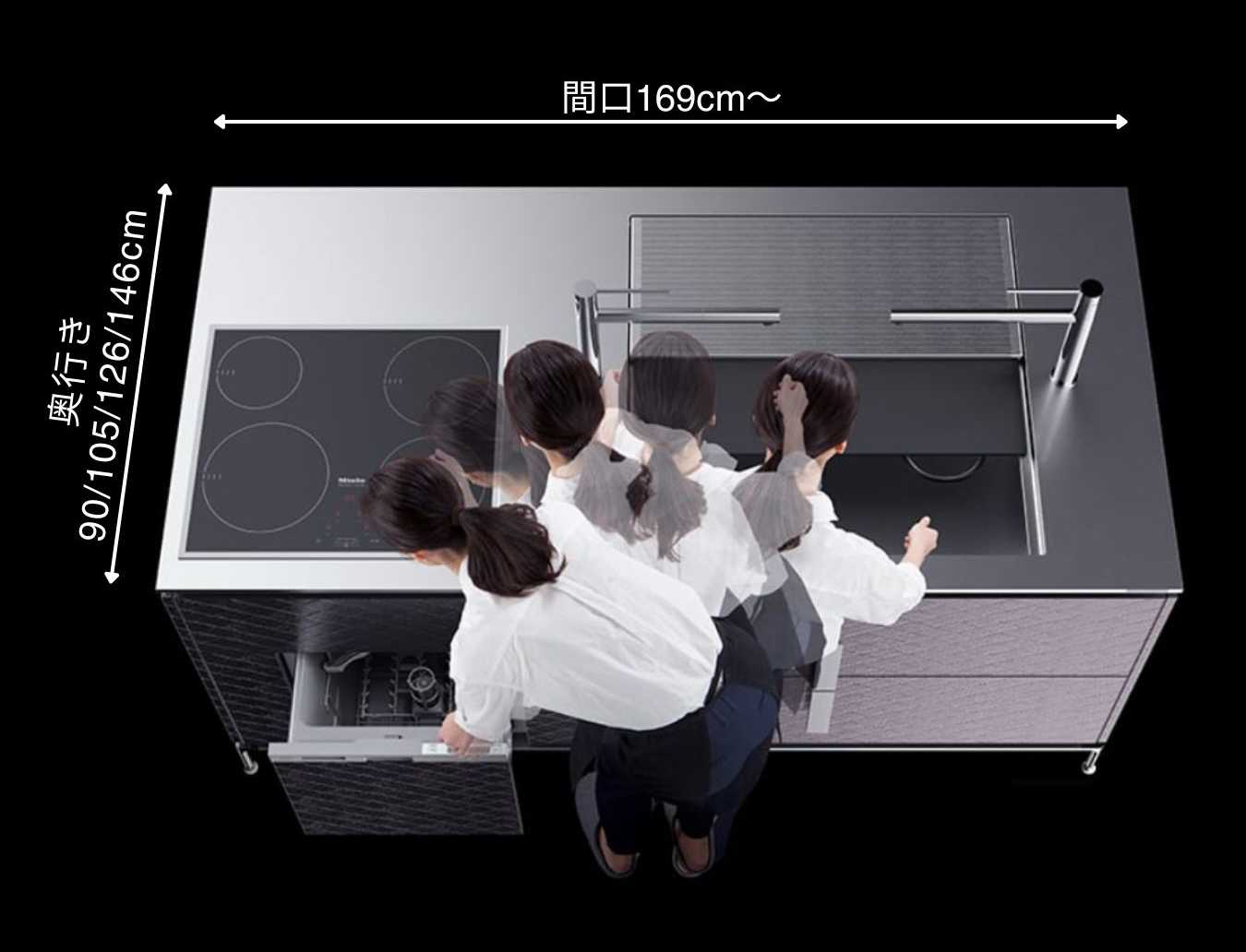 アイランドキッチン同様に最小間口は169cm~。奥行きは90、105、126、146の4サイズから選択できます。