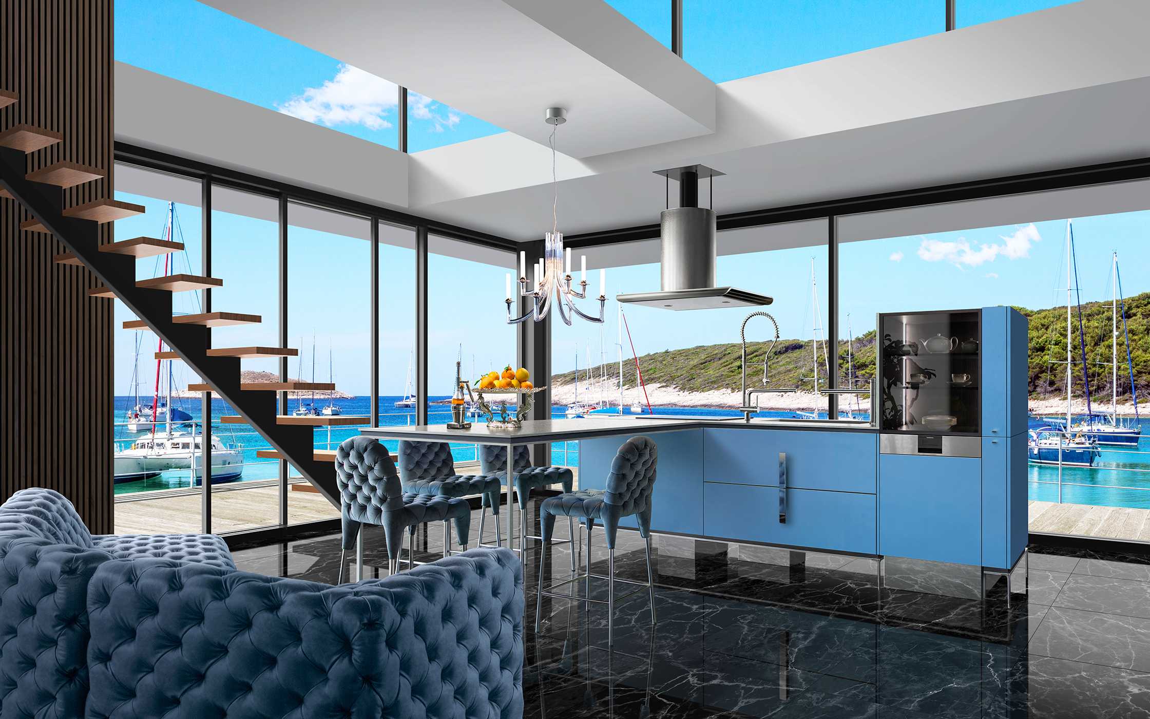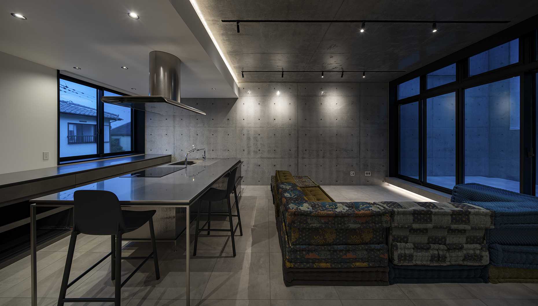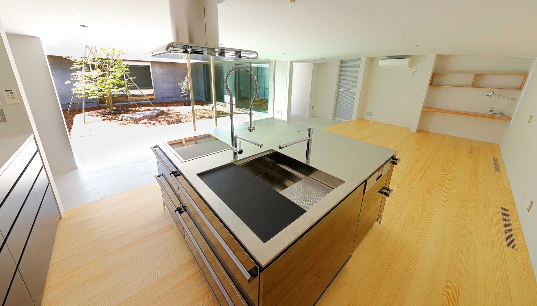 V形のアイランドキッチン。人間工学に基づき、身体の向きを変えるだけで無駄な動きをなくすことができます。キッチンに立つと自然と視界が広がるため、ダイニング・リビングとのコミュニケーションもスムーズです。また、視線が集まるため、キッチンに立つ方が空間の主役に。