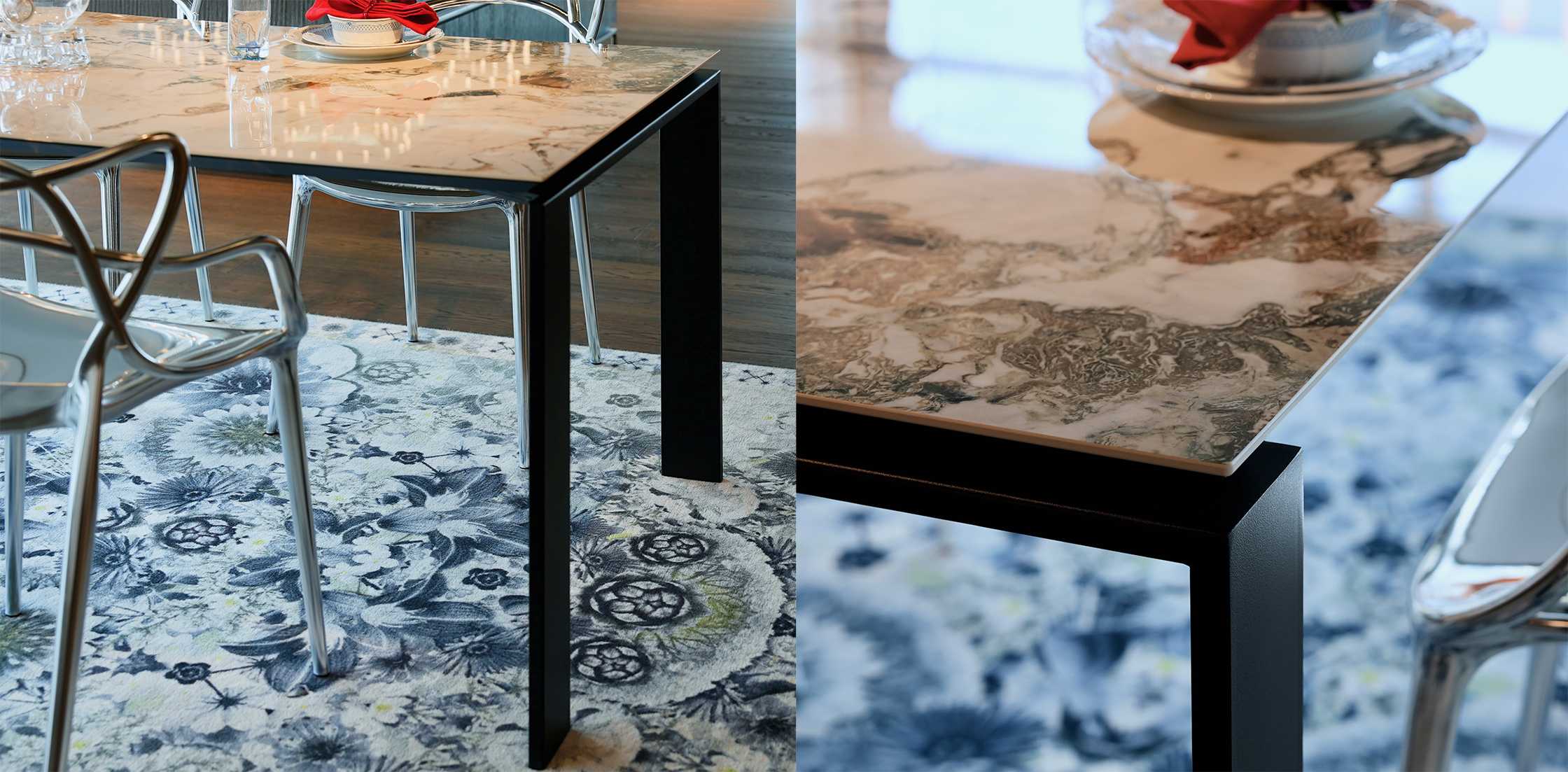 テーブルを選ぶ際には、脚のデザインも重要な要素です。離れた場所やソファに座って低い視線でテーブルを見ると、天板よりも脚のデザインに目がいくことが多いです。本物の大理石とは異なり、セラミックトップは薄く成型できるうえに強度も高いため、多様なデザインの脚を採用しやすいという魅力があります。