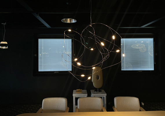ブラックコーティングされた小枝のような細いステンレスが複雑に繋がりあって、全体のフォルムと構造を作り出しています。
