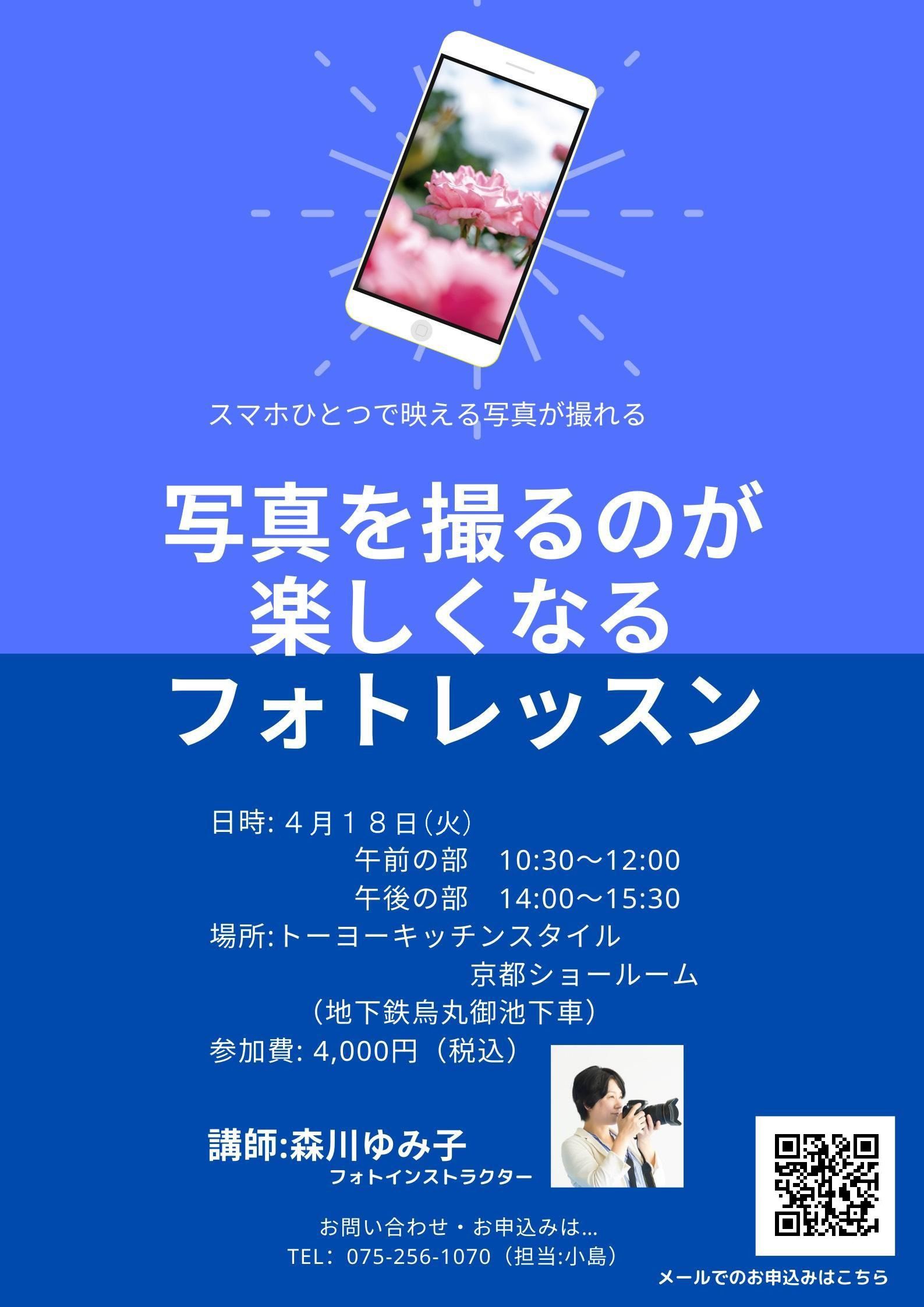 京都ショールームでは講師に森川ゆみ子氏をお迎えし「スマホひとつで映える写真が撮れる・写真を撮るのが楽しくなるフォトレッスン」を開催します。