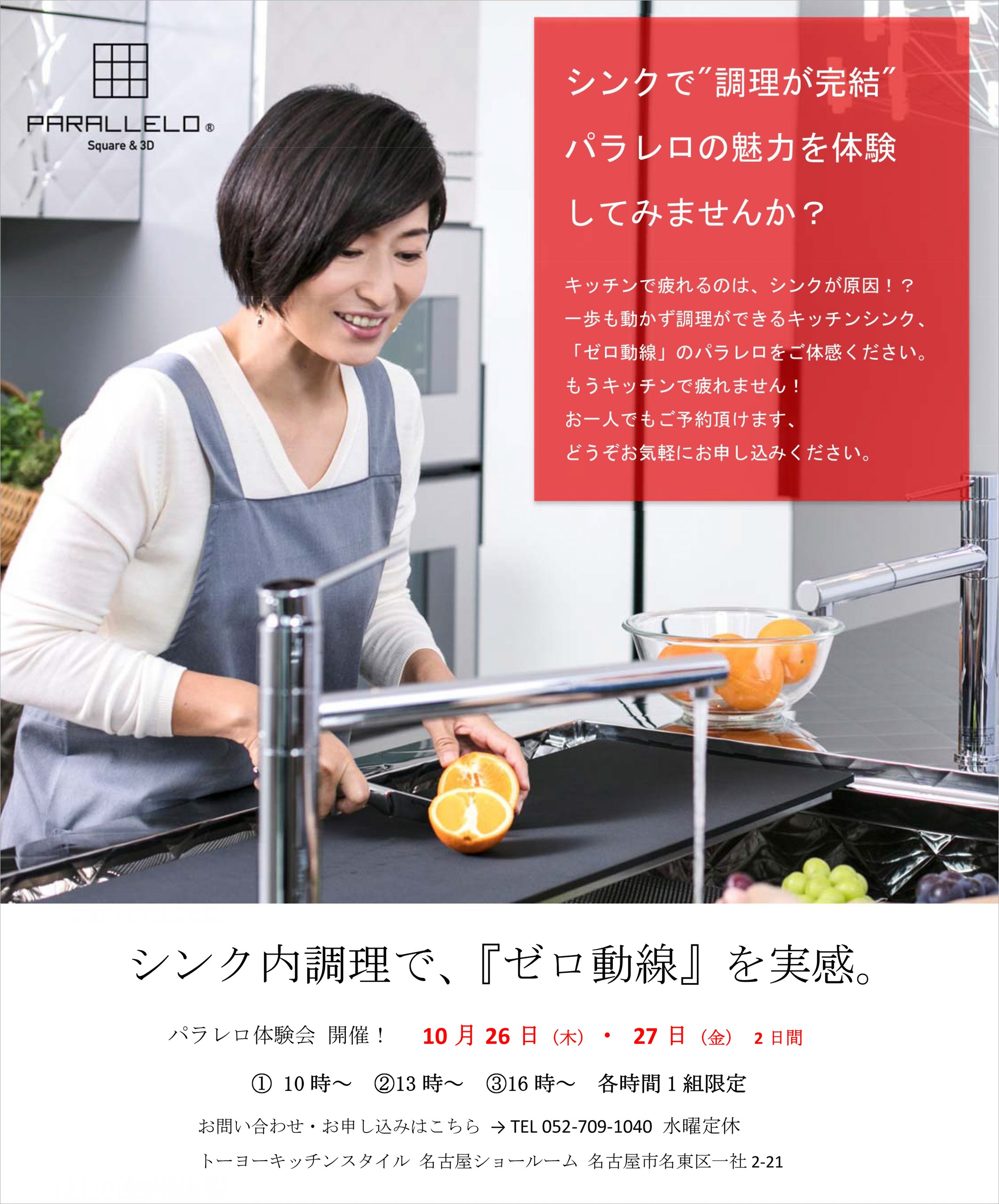 シンクで"調理が完結"パラレロの魅力を体験してみませんか? キッチンで疲れるのは、シンクが原因!? 一歩も動かず調理ができるキッチンシンク「ゼロ動線」のパラレロをご体感ください。 もうキッチンで疲れません。 お一人さまでもご予約いただけます。 どうぞお気軽にお申し込みください。 日時:2023年10月26日(木)・27日(金) 10:00~ / 13:00~ / 16:00~ 各回一組様限定 参加ご希望の方は下記お申し込みフォームよりご予約ください。 ご予約フォーム お電話でも受け付けております。 TEL:052-709-1040(担当:森前) 参加は無料です。 みなさまのご参加、お待ちいたしております。
