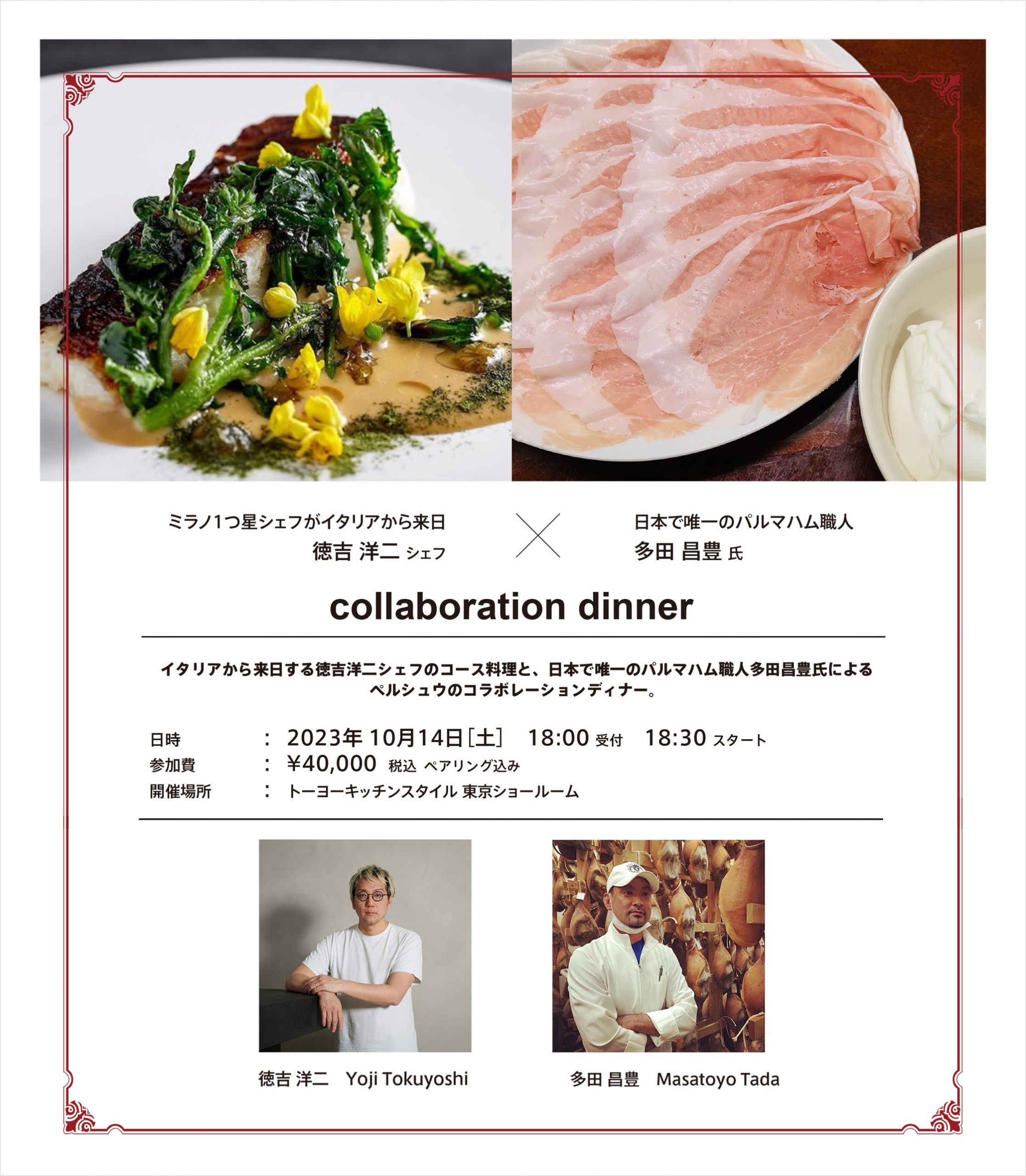 東京ショールームにて、イタリアから来日する徳吉洋二シェフのコース料理と、日本で唯一のパルマハム職人、多田昌豊氏によるペルシュウのコラボレーションディナーを開催します。