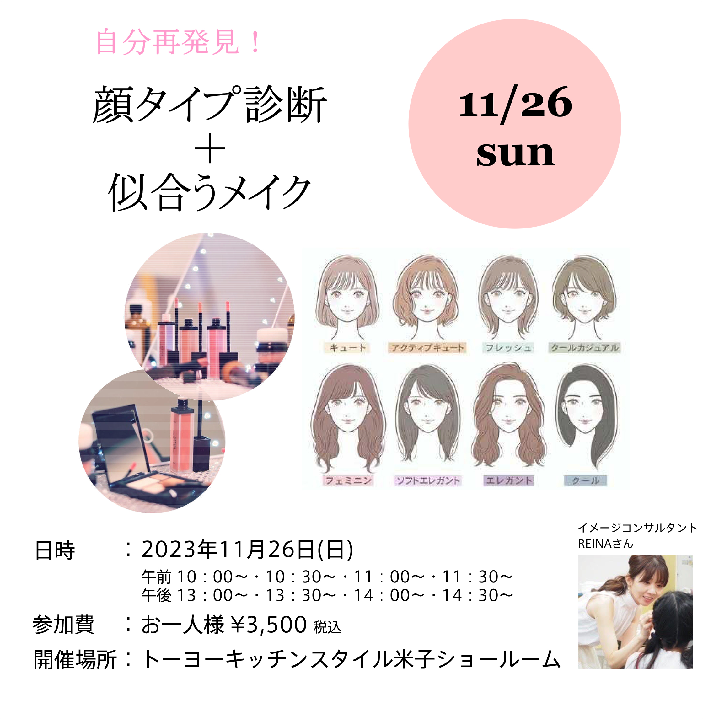 米子ショールームにて、イメージコンサルタントREINAさんによる「顔タイプ診断+似合うコスメ」イベントを開催します。