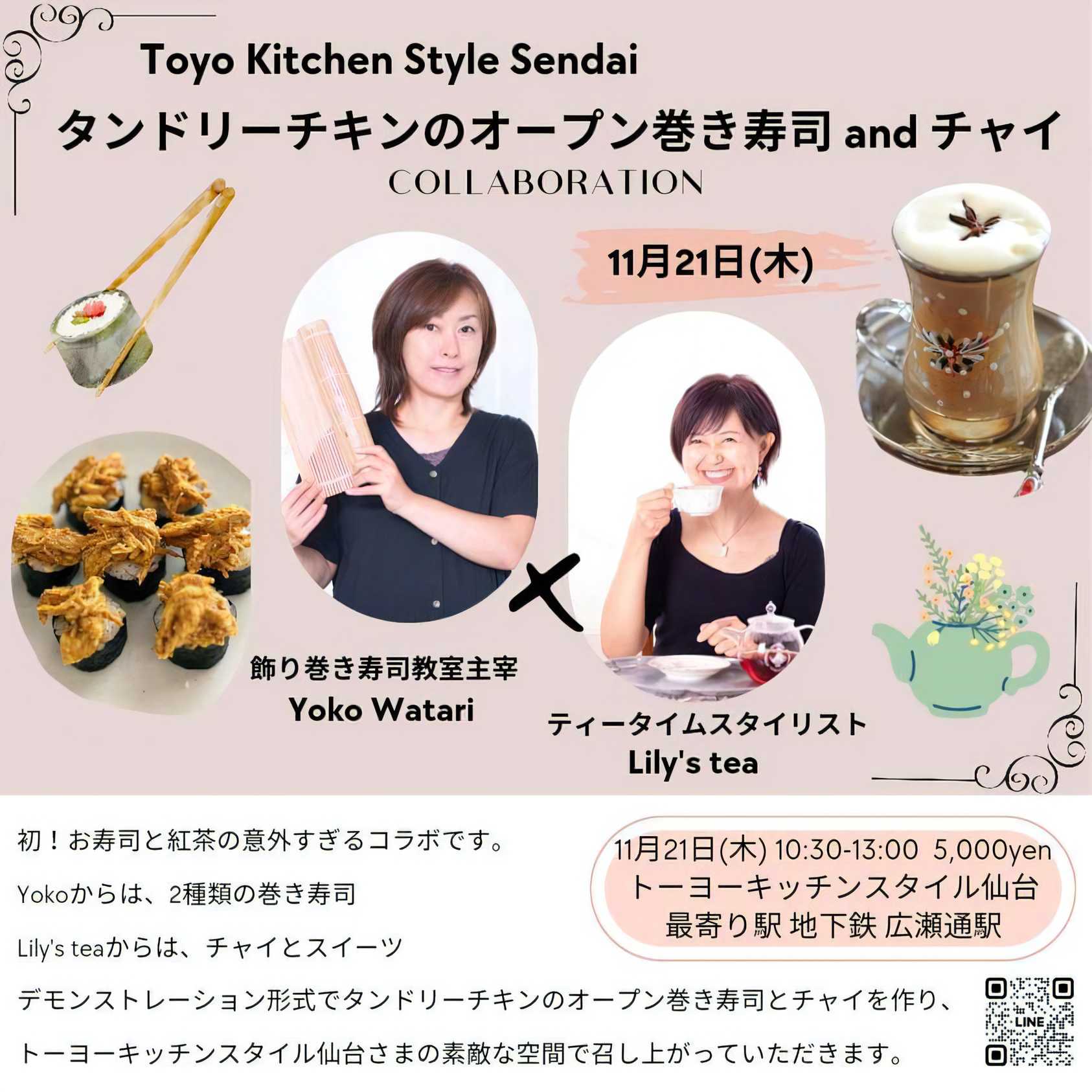 仙台ショールームでは、飾り巻き寿司教室主催 亘理洋子先生、ティータイムスタイリスト® Lily's tea 柴田 麗麗先生による、タンドリーチキンのオープン巻き寿司andチャイのワークショップを開催いたします。