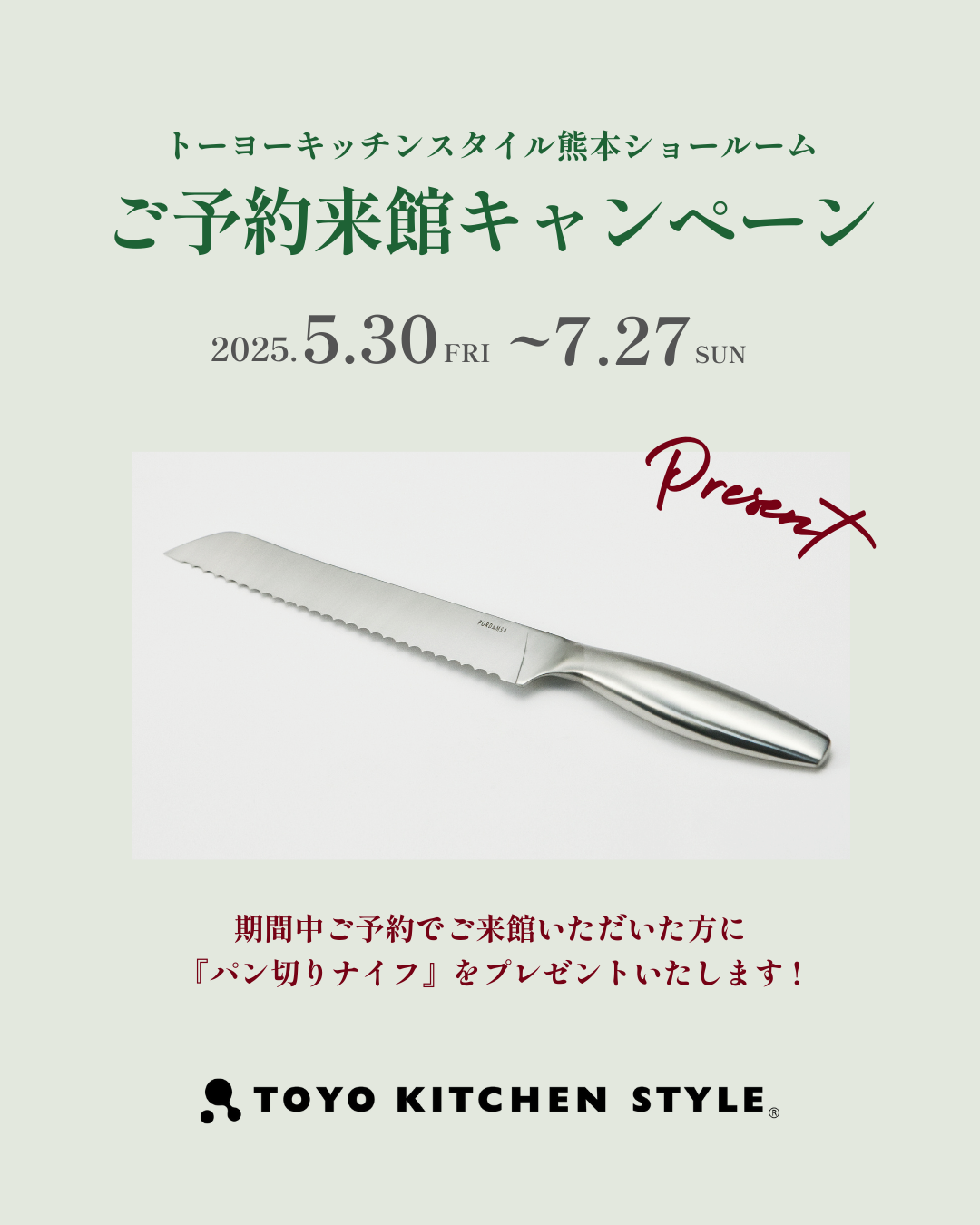 熊本ショールームでは5月30日より「ご予約来館キャンペーン」を開催します。 期間中ご予約でご来館いただいた方に「パン切りナイフ」をプレゼントいたします。