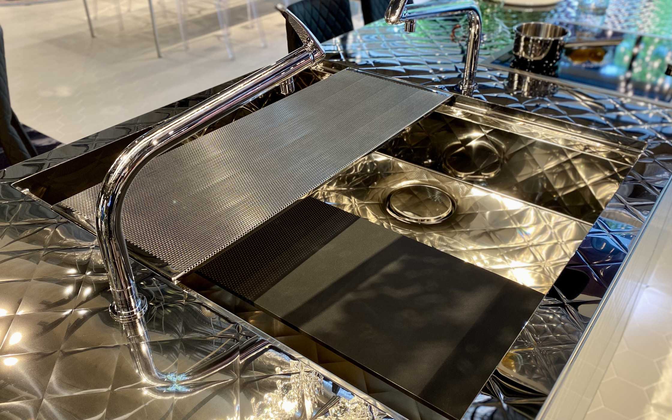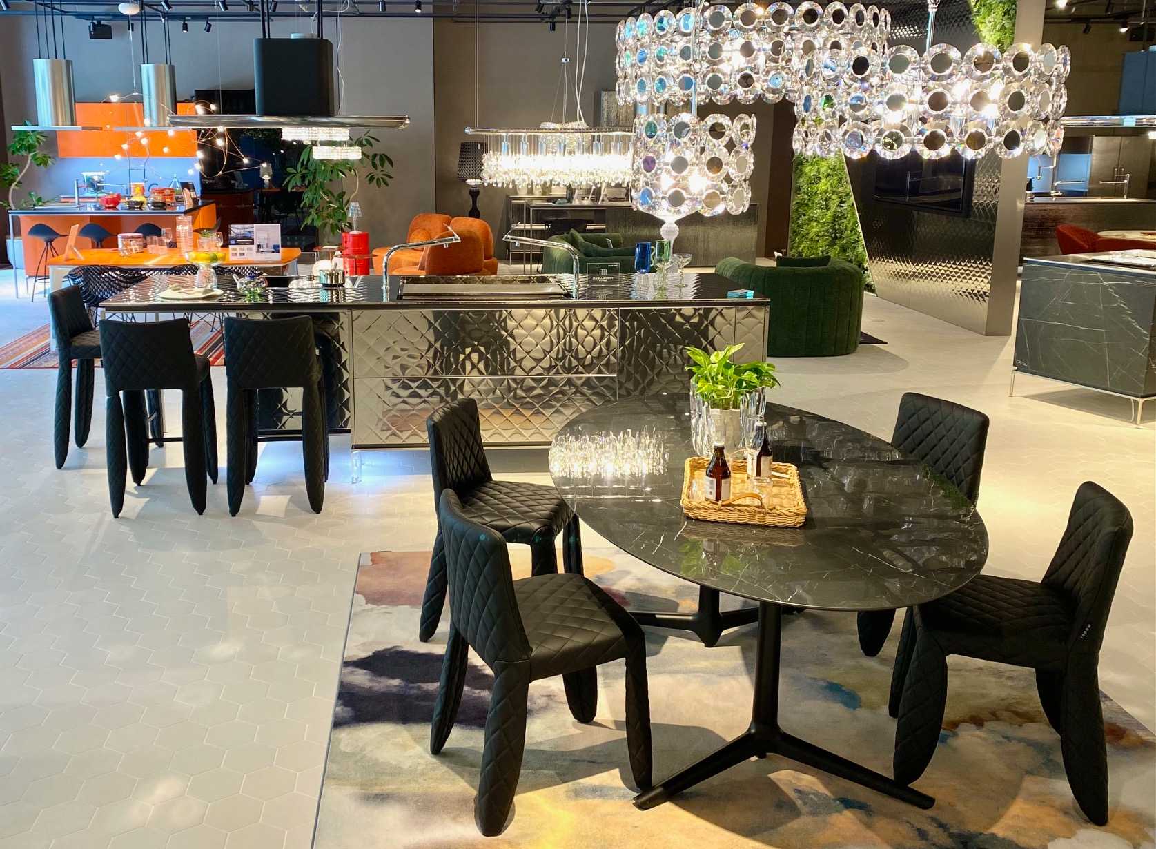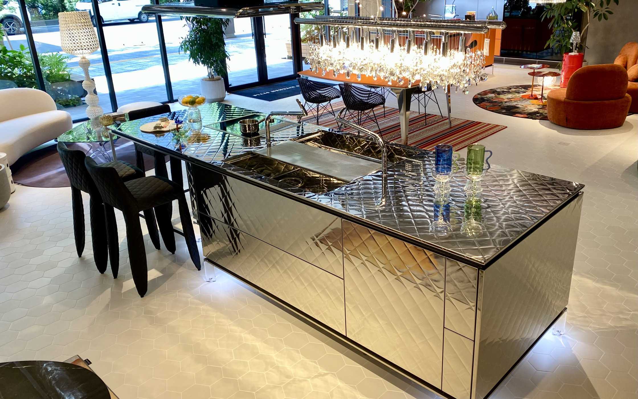ショールーム中央に見える、まるでミシンで縫い上げたかのようなキルティングを施したキッチン「キルト」。
