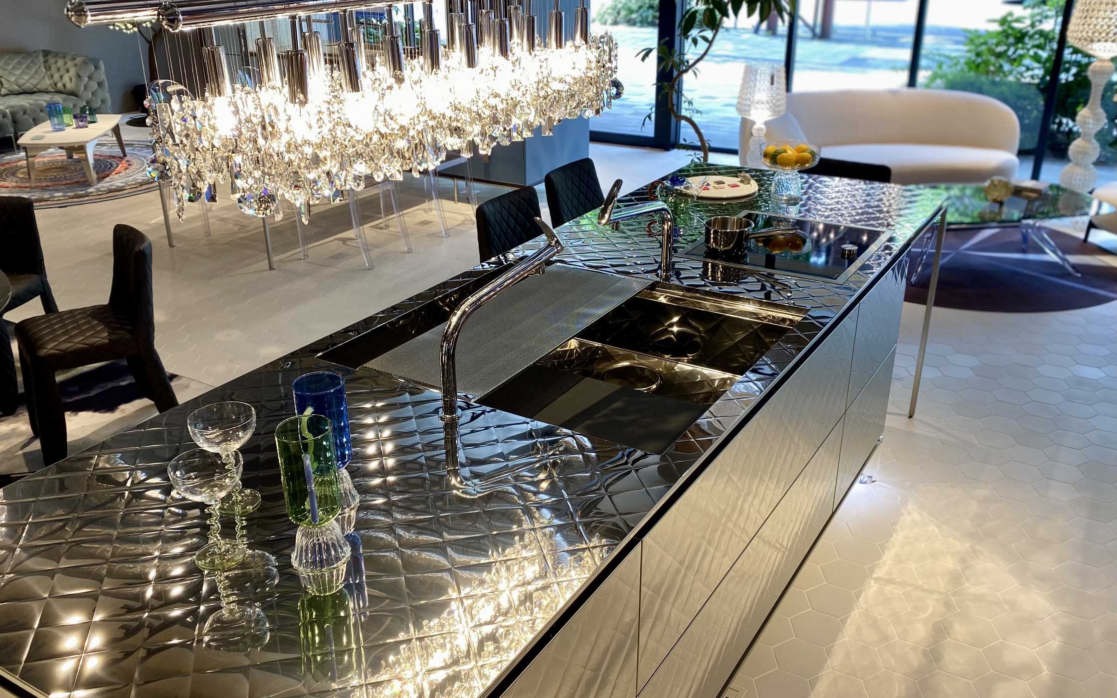 キッチンの上にきらめく「クランカーLED120」は光が鏡面仕上げのキッチンに反射し、空間全体に美しい輝きを散りばめてくれるのでおすすめです。