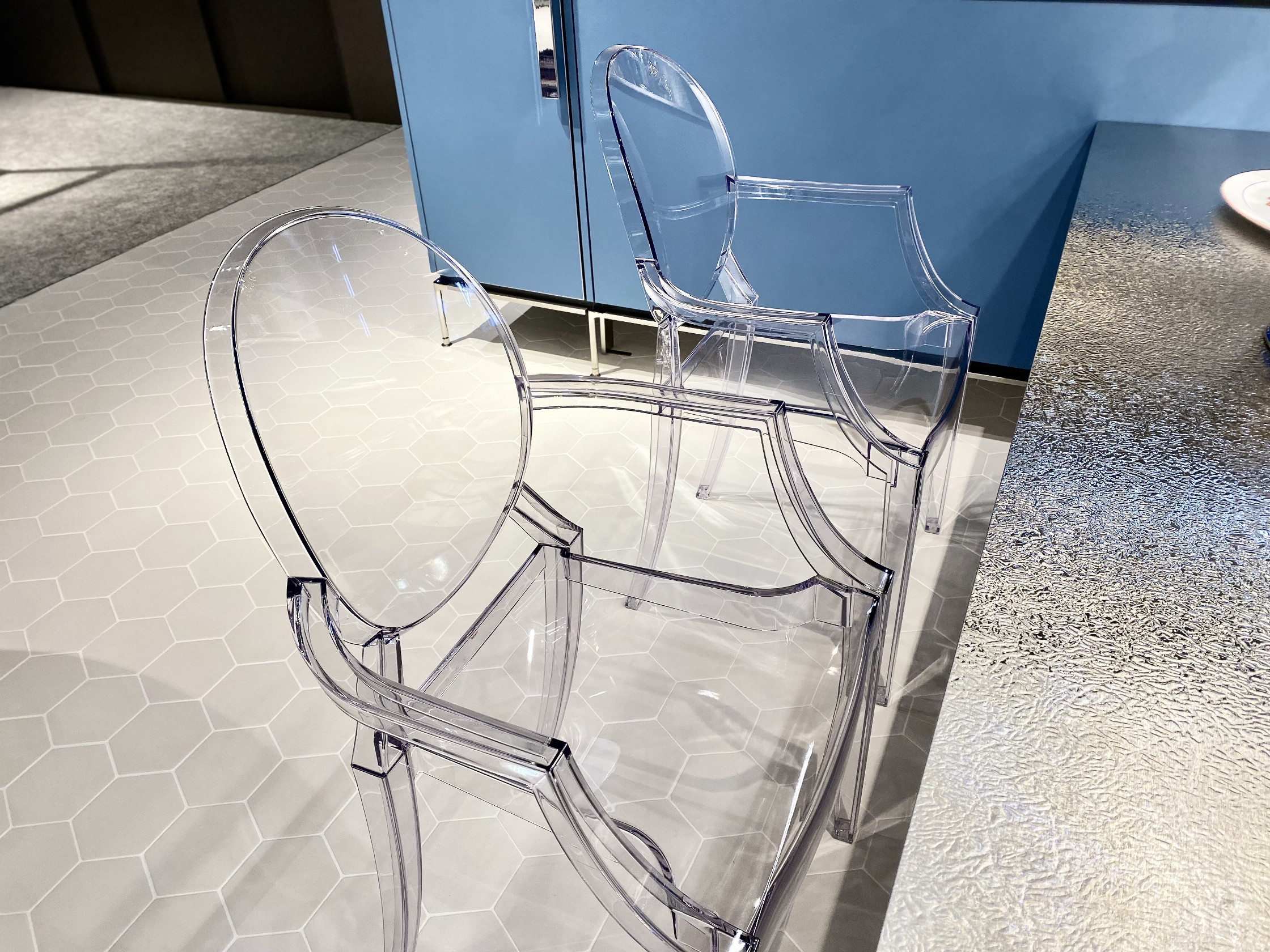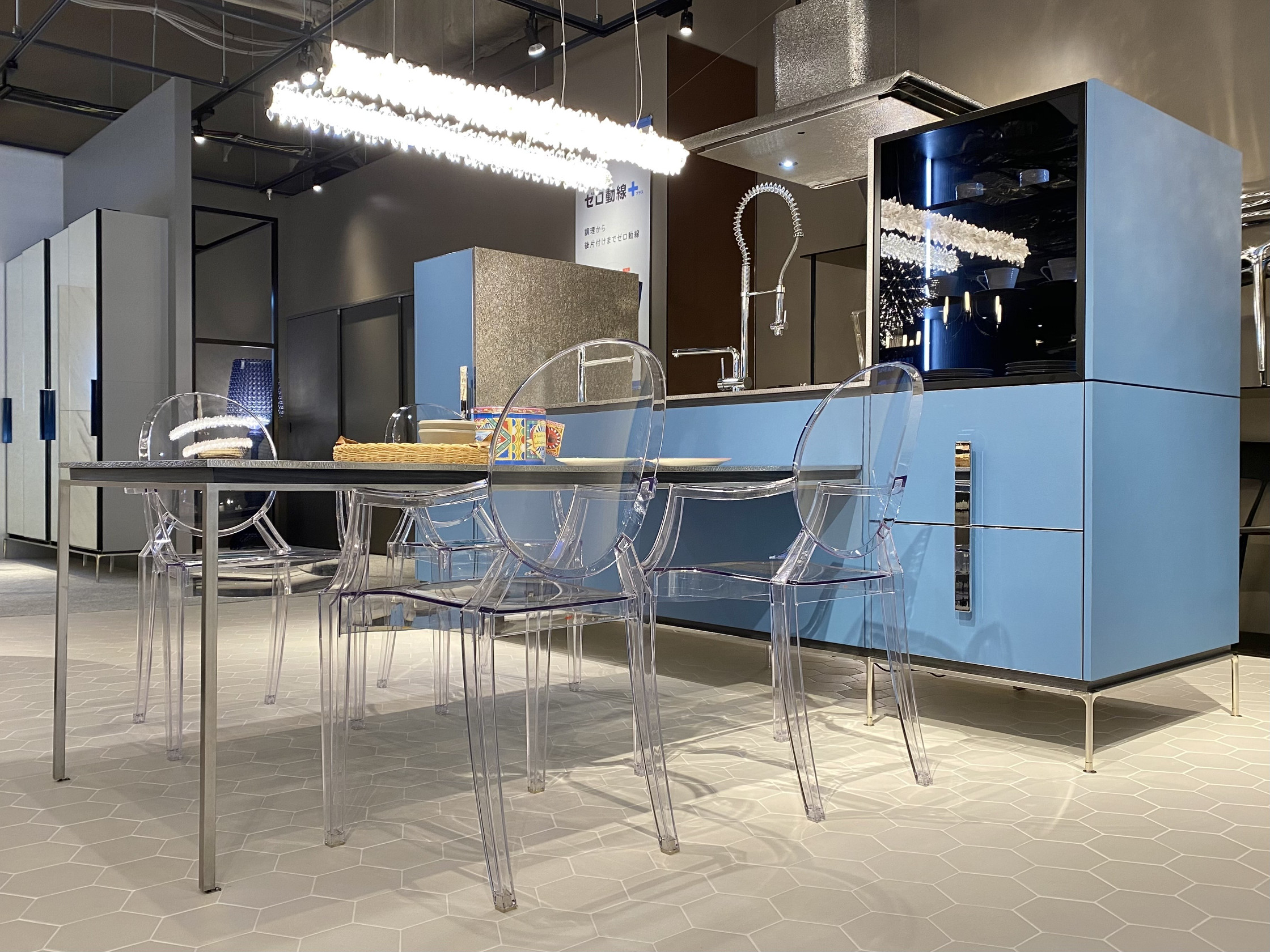 透明なフォルムがキッチンの美しさを引き立てつつ、空間全体に軽やかさと洗練さをプラス。