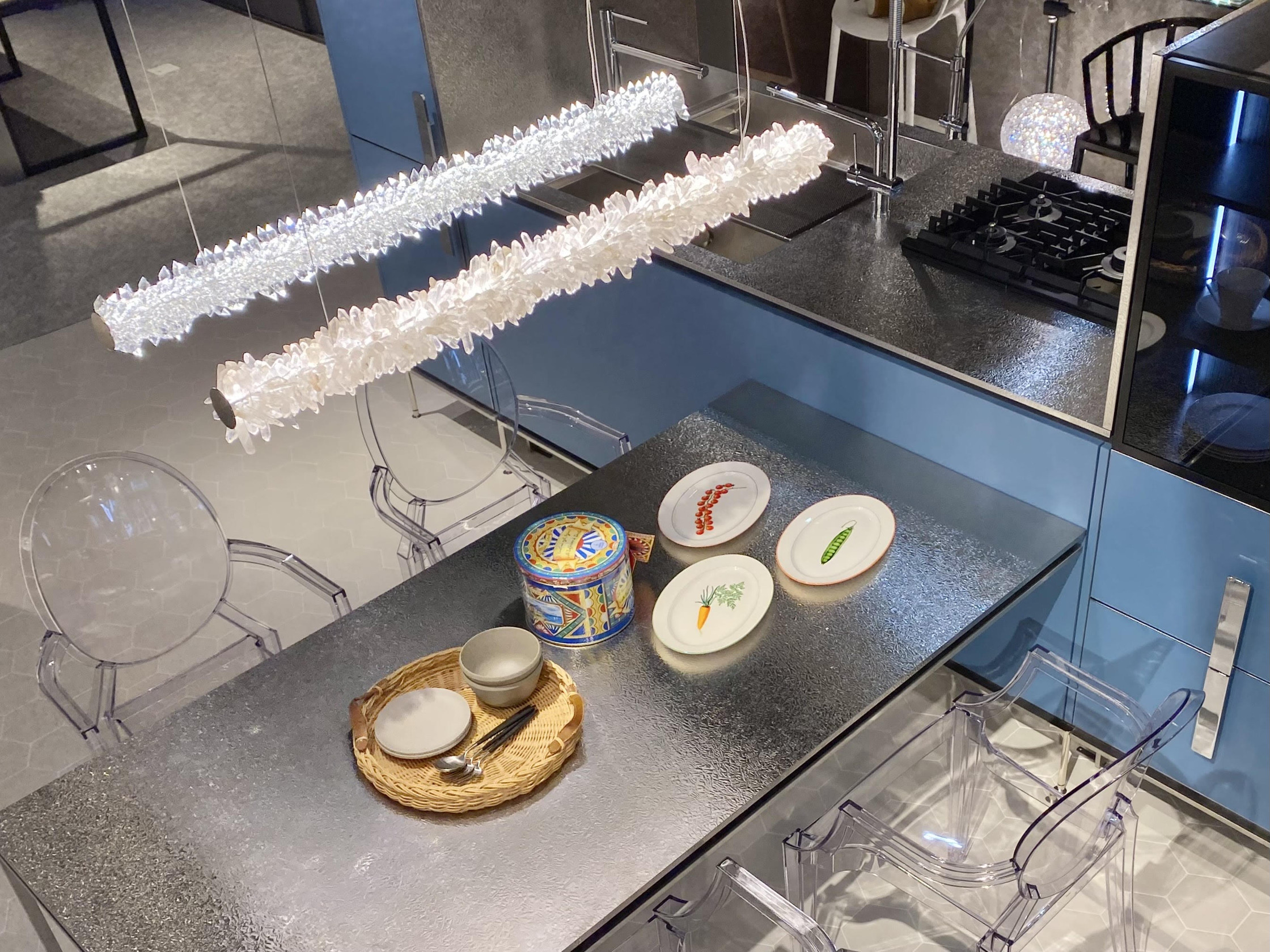 クリスタルガラスが星のように煌々と輝く「クランカーバーL100」と、天然水晶が織り成す温かく柔らかな光が魅力の「クランカーバーL100ナチュラル」がテーブルの上から照らすことにより、ダイニングテーブルの柄がまるで水面のようにきらめきます。